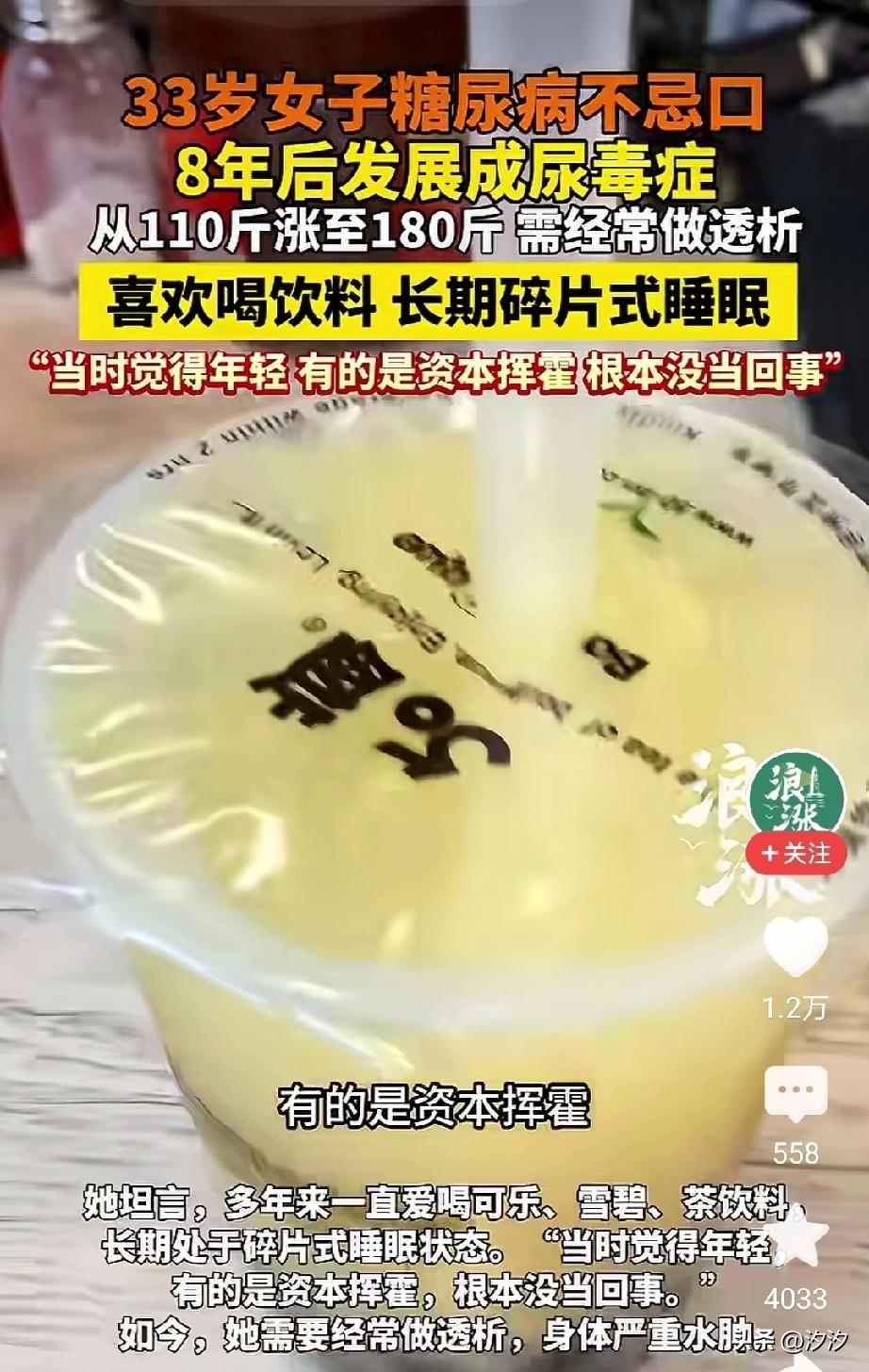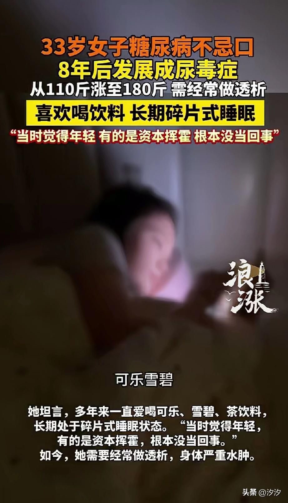 郑州33岁的一个女孩, 确诊了尿毒症, 她自己讲述了自己的不良生活习惯, 当时她觉得自己非常年轻, 每天就是喝可乐、雪碧和各种奶茶, 也没觉得有什么不妥, 晚上也是熬夜玩手机, 觉得没有什么大不了, 就这样8年发展成了尿毒症, 她的体重直接从110斤暴涨到180斤, 如今的她身体早已亏空, 每天都要去做透析, 可以说是非常的痛苦了, 不良的生活习惯真要不得, 不要以为自己年轻就可以随意挥霍, 人就像机器一样, 长时间紧绷着就容易出问题, 不要等到真的出了问题才后悔, 那个时候真的没有是任何办法了, 所以家长说的,早睡早起真的没有错, 不过在现在这个快节奏的生活当中, 又有几个人可以做到呢?