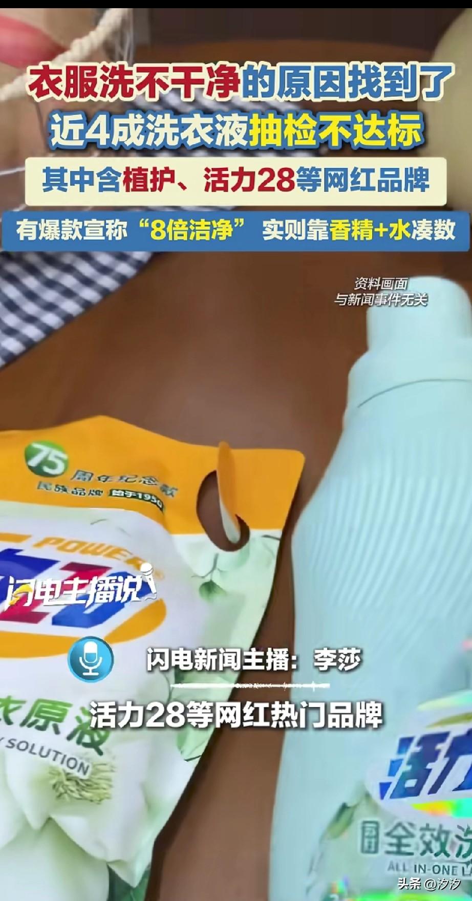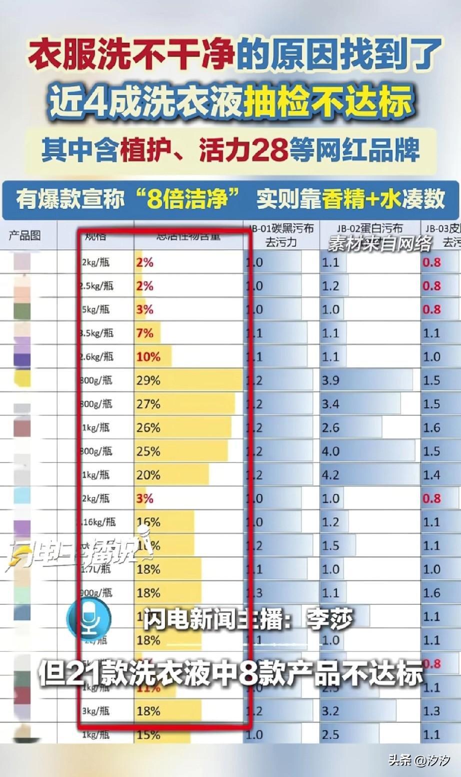 衣服洗不干净的原因找到了, 并是大家的洗衣机老了, 也不是你的衣服穿的太脏了, 而是洗衣液不达标, 我们怀疑了所有的可能性, 唯独没有对洗衣液产生怀疑, 如果恰恰是洗衣液出了问题, 记者挑选了市面上21种洗衣, 结果发现就有八种不合格, 有效成分不足2%, 有些甚至号称八倍洁净, 实际上却是用香精和水凑数, 很多知名品牌不乏其中, 快去查查你家的洗衣机有没有问题?