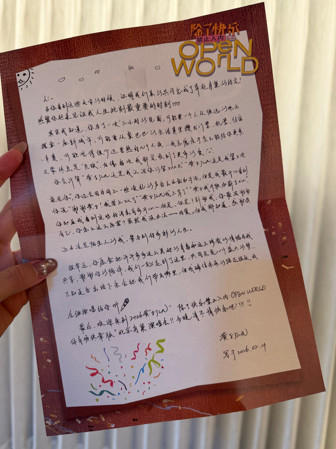 黄子弘凡情人节手写信黄子弘凡北京鸟巢演唱会伴手礼黄子弘凡用细节打动每一位堡妹!北京鸟巢演唱会伴手礼诚意十足,暖宝宝、票根、小卡、彩带,亲笔手写信治愈满分。3月14白色情人节,温柔与热爱撞个满怀,期待今晚黄子弘凡鸟巢演唱会!
