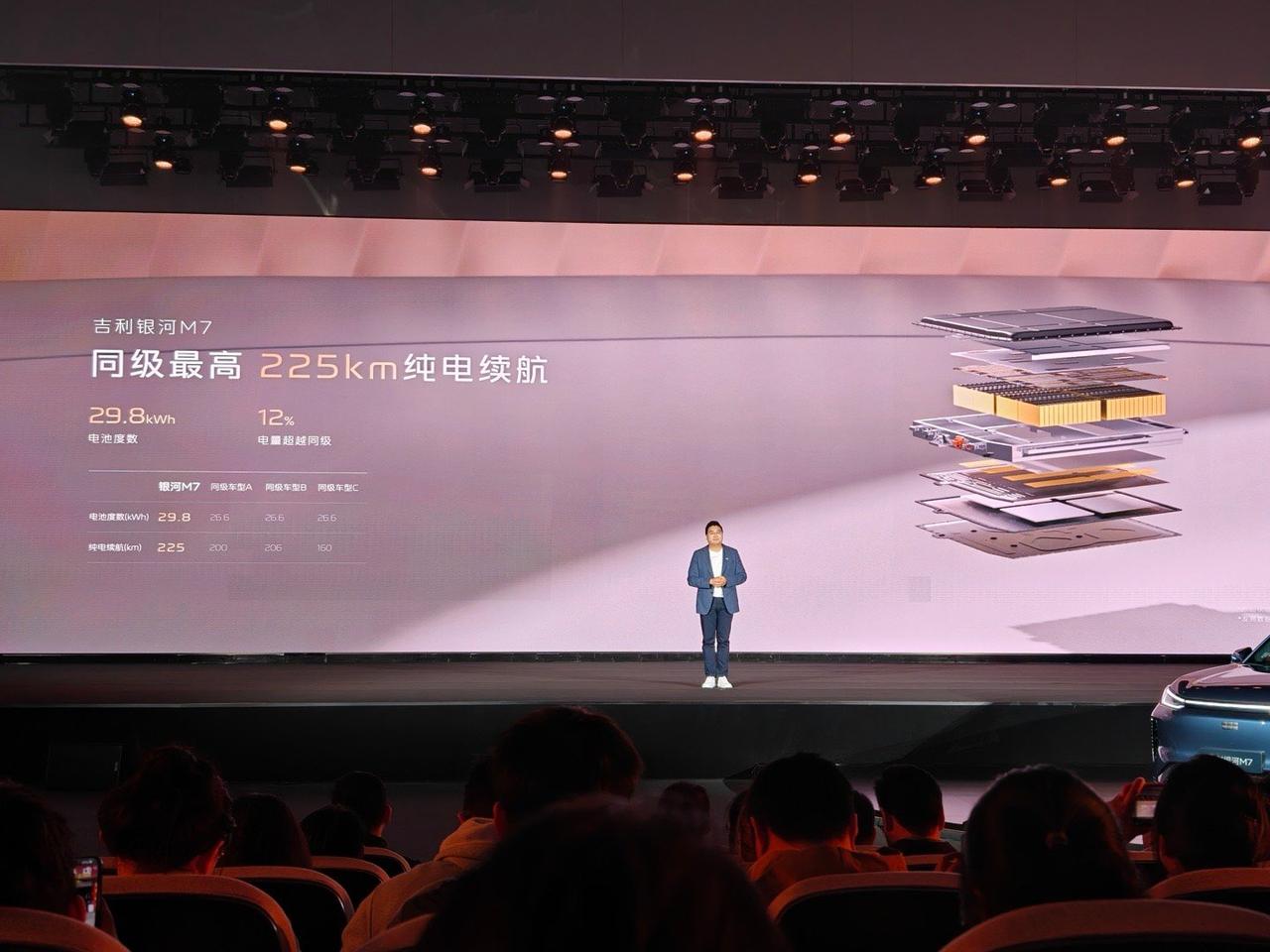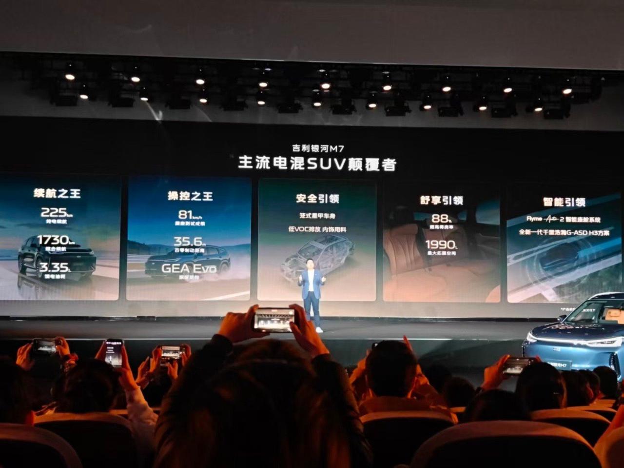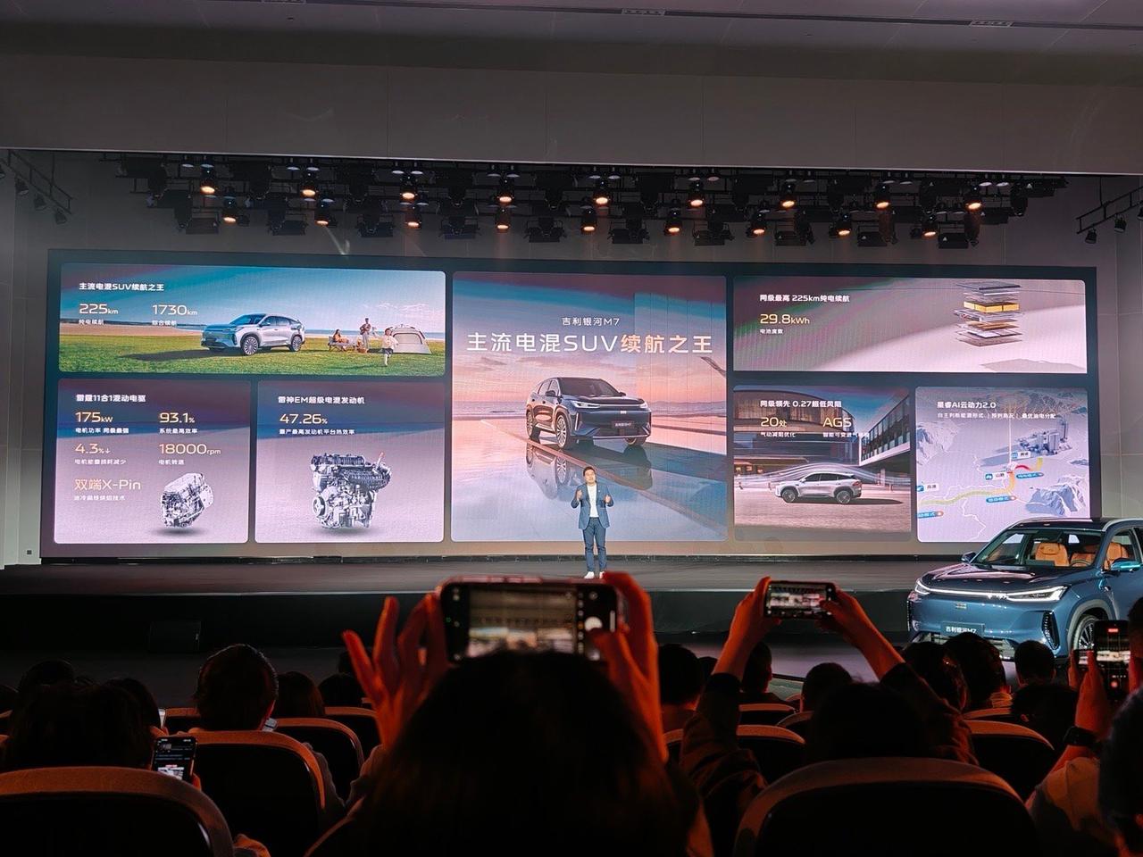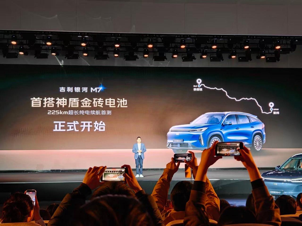 吉利银河 M7 在衢州,金砖电池的诞生工厂完成技术首秀。这台车定位银河 M 系列首款主流电混 SUV,这次只是一个首秀,并没有价格,计划 26 年上半年上市。这台车核心围绕这几项指标:CLTC 纯电续航 225km,满油满电综合续航 1730km,麋鹿测试成绩 81km/h,馈电油耗 3.35L/100km。 动力层面搭载雷神 EM 电混系统,发动机热效率 47.26%,配合星睿 AI 云动力 2.0 与无图决策能量管理,优化整车能耗表现。底盘采用前麦弗逊 + 后多连杆结构。 这台车搭载的神盾金砖电池29.8kWh混动专用包,空间利用率提升5%,电芯循环寿命超4500次,支持 30%–80% 快充 15 分钟。电池通过雷击、挤压、八针同刺等极限测试,构建四道安全防线。强调长续航、快充、耐用、安全四项特性。 神盾金砖电池将逐步搭载至银河全系混动车型,推动纯电续航普遍突破 200km,品牌进入长续航阶段。