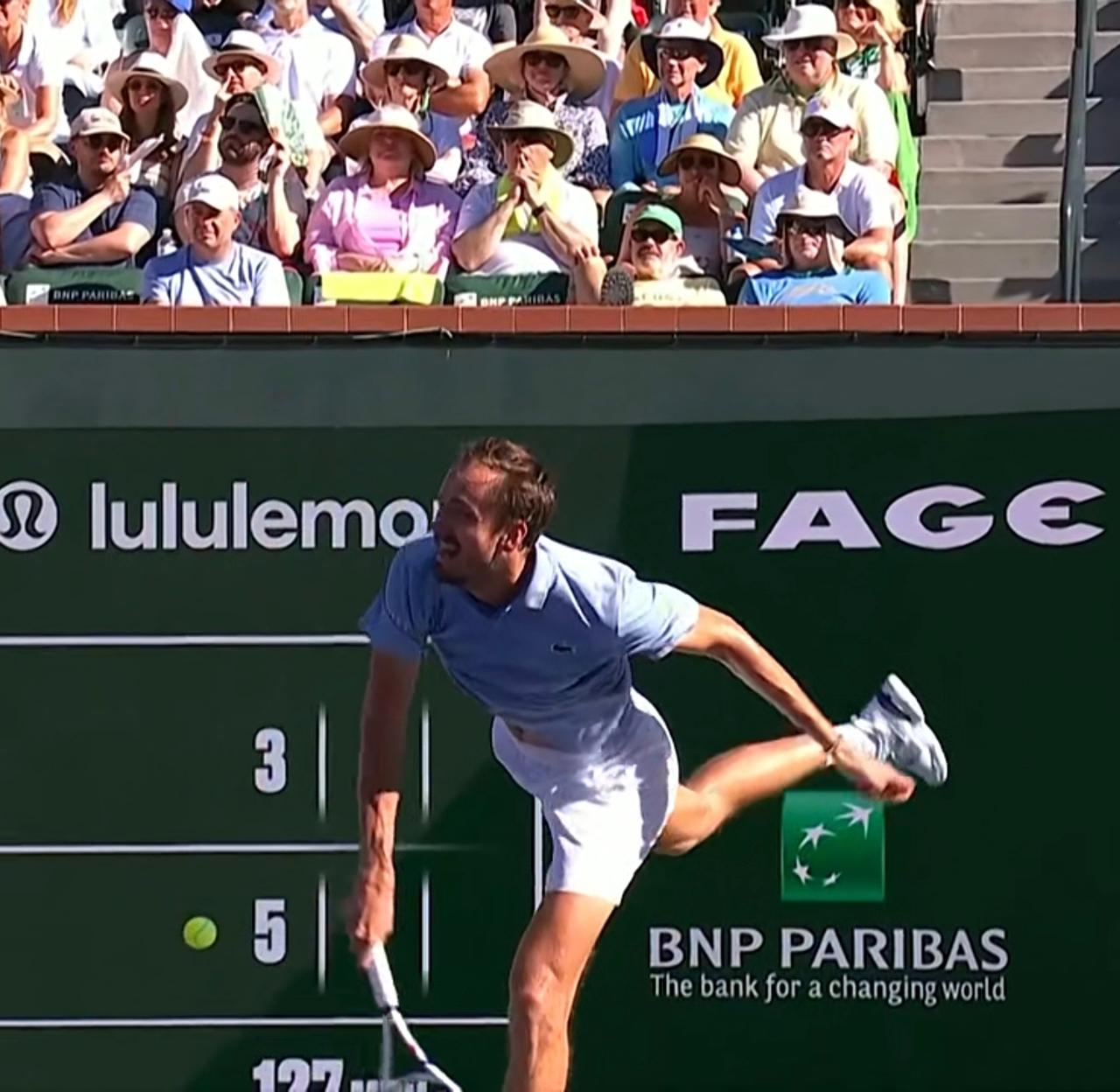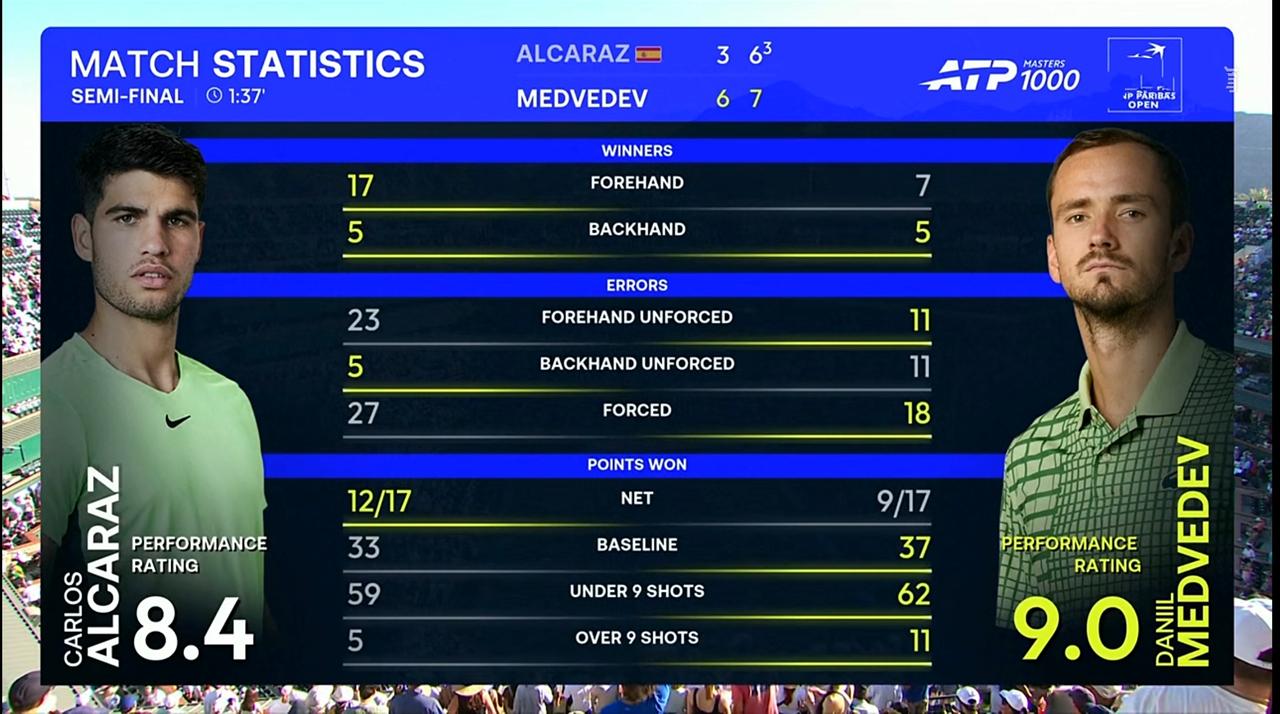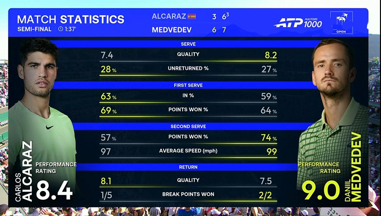 阿尔卡拉斯印第安维尔斯大师赛半决赛完败梅德韦杰夫,无缘决赛 北京时间2026年3月15日早上,印第安维尔斯大师赛半决赛,阿尔卡拉斯对阵梅德韦杰夫。 第一盘,阿尔卡拉斯被破掉一局,最终以3:6的比分丢掉首盘。 第二盘。第四局,阿尔卡拉斯逼出连续两个破发点,随即兑现破发。3:1。第五局,梅德韦杰夫逼出连续两个破发点,随着抢接发直得,完成回破,2:3。第八局,阿尔卡拉斯逼出一个破发点,随后梅德韦杰夫连拿三分,有惊无险,完成保发4:4。第十局,梅德韦杰夫非保不可发球局,被逼出一个破发点,随后连续正手进攻得手,回到平分。多拍对攻中阿尔卡拉斯放小球致胜,再次拿到破发点。最后,梅德韦杰夫靠好的发球,连拿三分,艰难保发。5:5。第十二局,梅德韦杰夫顽强保发,6:6。 抢七,5:1,梅德韦杰夫领先交换场地。随后,梅德韦杰夫一发直得,拿到连续五个赛点。最终,梅德韦杰夫以一记内角ACE结束战斗。7:3。 7:6(3),梅德韦杰夫再下一城。大比分2:0,梅德韦杰夫完胜阿尔卡拉斯,晋级决赛。 比赛来到第二盘,阿尔卡拉斯多次放短球和发球上网屡屡得手,为自己赢得一些主动,几乎每赢一球都握拳庆祝。梅德韦杰夫拼抢积极,敢于变线,打出许多精彩球,冷静而凶悍。 技术统计显示,梅德韦杰夫明显占优。 阿尔卡拉斯无缘决赛。 接下来的决赛,梅德韦杰夫将迎战世界第二辛纳。