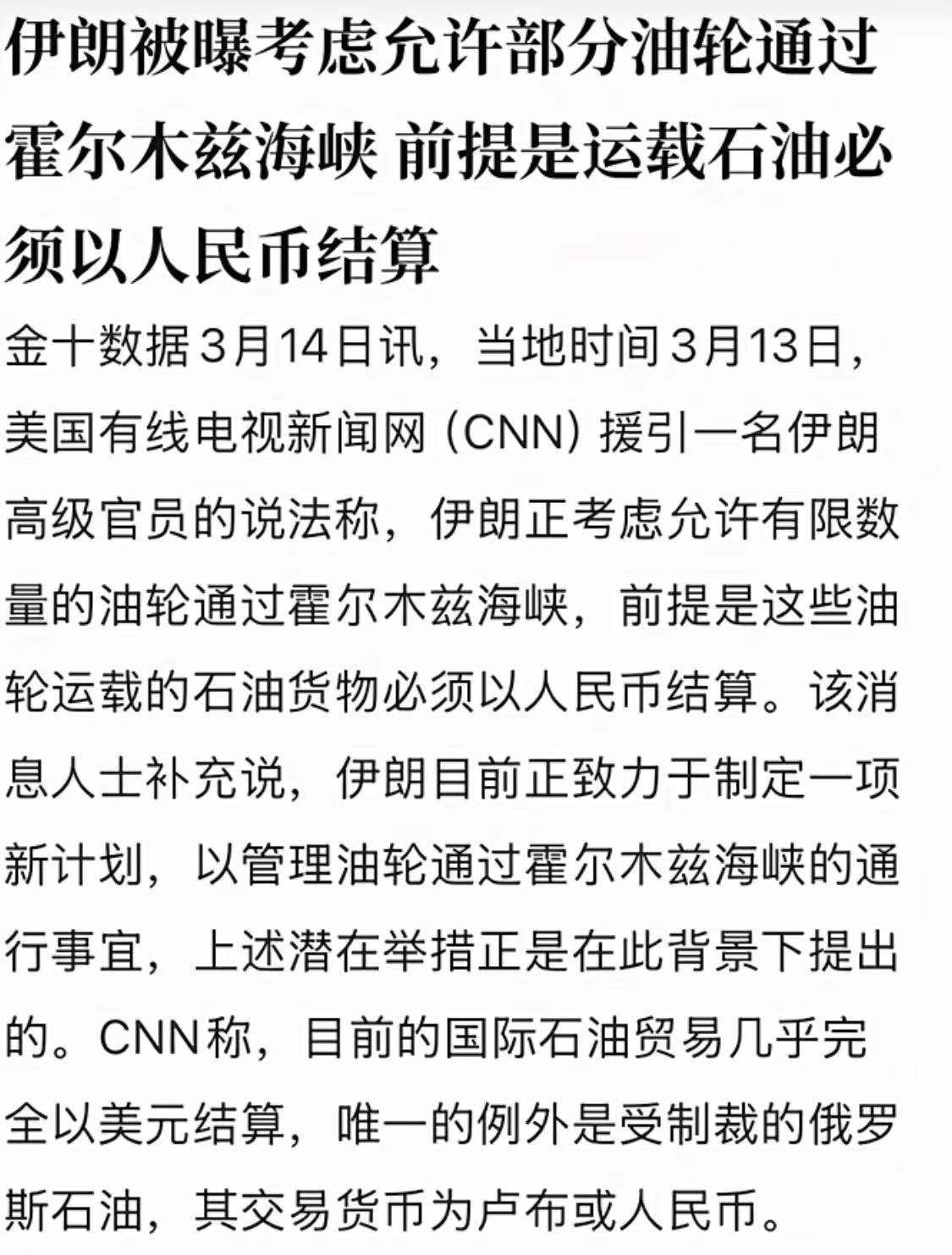 美国听到一个好消息,伊朗准备放行部分油轮,同时听到一个坏消息,通行油轮必须采取人民币结算。 新华社消息,伊朗正考虑允许有限数量的油轮通过霍尔木兹海峡,前提是这些油轮运输的石油必须以人民币结算,这一消息是由一名伊朗高级官员向美国有线电视新闻网(CNN)透露的。从目前各方面消息看,这个消息应该是真的。因为印度已经就油轮问题与伊朗进行谈判,主要是允许油轮等通过霍尔木兹海峡问题。 越来越多的国家向伊朗提出油轮通过申请,迫于国际社会的压力,伊朗也开始做出让步,允许放开部分油轮通行。对于美国而言这确实是一个好消息,这意味着严峻的能源危机可能会缓解,从而导致美国内部面临的通胀压力降低。为了缓解能源危机,美国号召30多个国家释放战略石油储备,甚至放松对俄石油限制,允许印度等购买俄石油。 不过,美国也听到坏消息,那就是伊朗放行的油轮必须是使用人民币结算。美国军事打击伊朗一个重要战略目的就是巩固石油美元地位,为美国继续利用美元收割世界财富创造条件。全球石油贸易长期以来主要以美元计价和结算。伊朗此举如果付诸实施,将是对现有美元霸权地位的一次直接挑战,可能进一步推动全球能源结算体系的多元化。 伊朗在战争爆发后第一时间感谢了支持正义的中国,现在强调人民币结算,也算是给中国送来助攻与帮助。中国一直在积极推动以人民币购买国际大宗商品,特别是石油。伊朗的条件恰好契合了这一战略,有助于扩大人民币在国际贸易,特别是石油贸易中的使用范围。这对于中国而言显然是一个好消息。目前国际上石油结算大部分都是美元结算,除了俄罗斯石油是采取卢布和人民币结算。 对于美国而言,这次战争的目标总体上失败了,并且美国当前没有能力扭转失败局面。新华社消息,美国彭博社以美国陆军部长丹尼尔·德里斯科尔为消息源报道,美国已向中东地区部署1万架原本用于乌克兰的拦截无人机,以应对伊朗的空中打击。这些无人机本来是准备提供给乌克兰的。美国现在因为弹药紧张,已经开始采取拆东墙补西墙的策略。 在霍尔木兹海峡护航问题上,特朗普要求美军去护航,但是美军至今拒绝为任何油轮护航。美军清楚,一旦去护航,那么伊朗就可以使用导弹直接击沉美军军舰,这样导致的人员伤亡将是非常巨大的。可以说,对于霍尔木兹海峡通航问题上,美国根本找不到制衡伊朗的办法。美国空袭伊朗石油枢纽岛屿,也是对伊朗的警告,并不能解决问题。伊朗要求石油使用人民币结算,将进一步提升人民币的国际地位,从而导致美元霸权逐渐崩塌,这对于美国而言显然不是好消息。