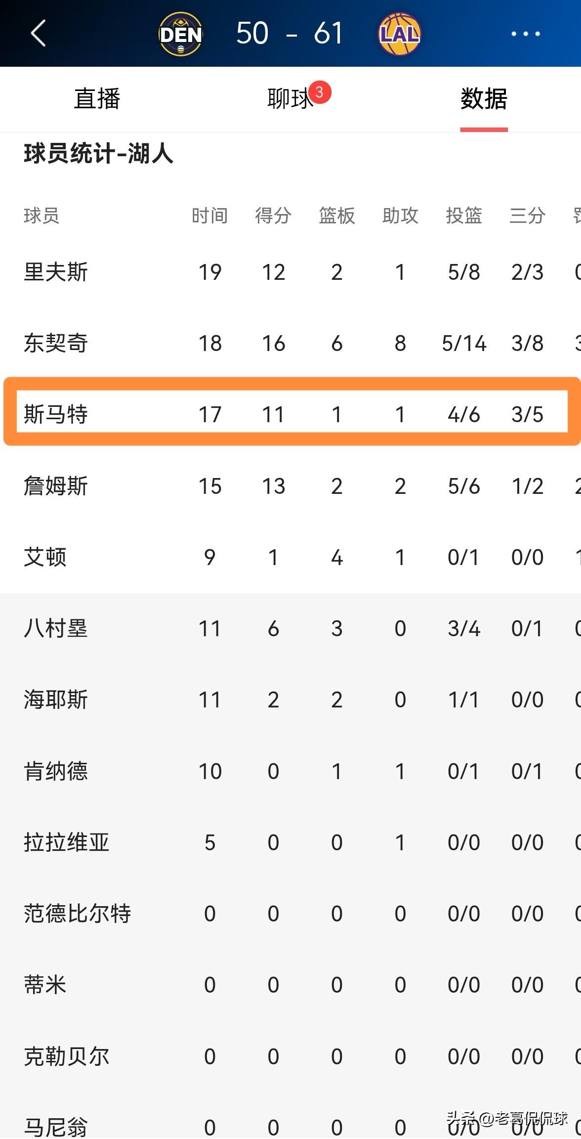 湖人大将斯玛特真是太让人惊喜了!在今天进行的湖人和掘金的焦点战中,目前双方的上半场比赛已经结束,湖人以61:50处于领先。让人感到非常惊喜的是,在前两节比赛中,斯玛特这棵铁树竟然开花了,他在首发出战的17分钟里,投篮6中4,其中三分球5中3非常高效的得到11分,还有1篮板1助攻1抢断,没有出现任何的失误,他的场上正负值为+10。 实事求是的说,我万万没有想到斯玛特的投篮手感竟然如此火热,这真是让人惊喜万分。