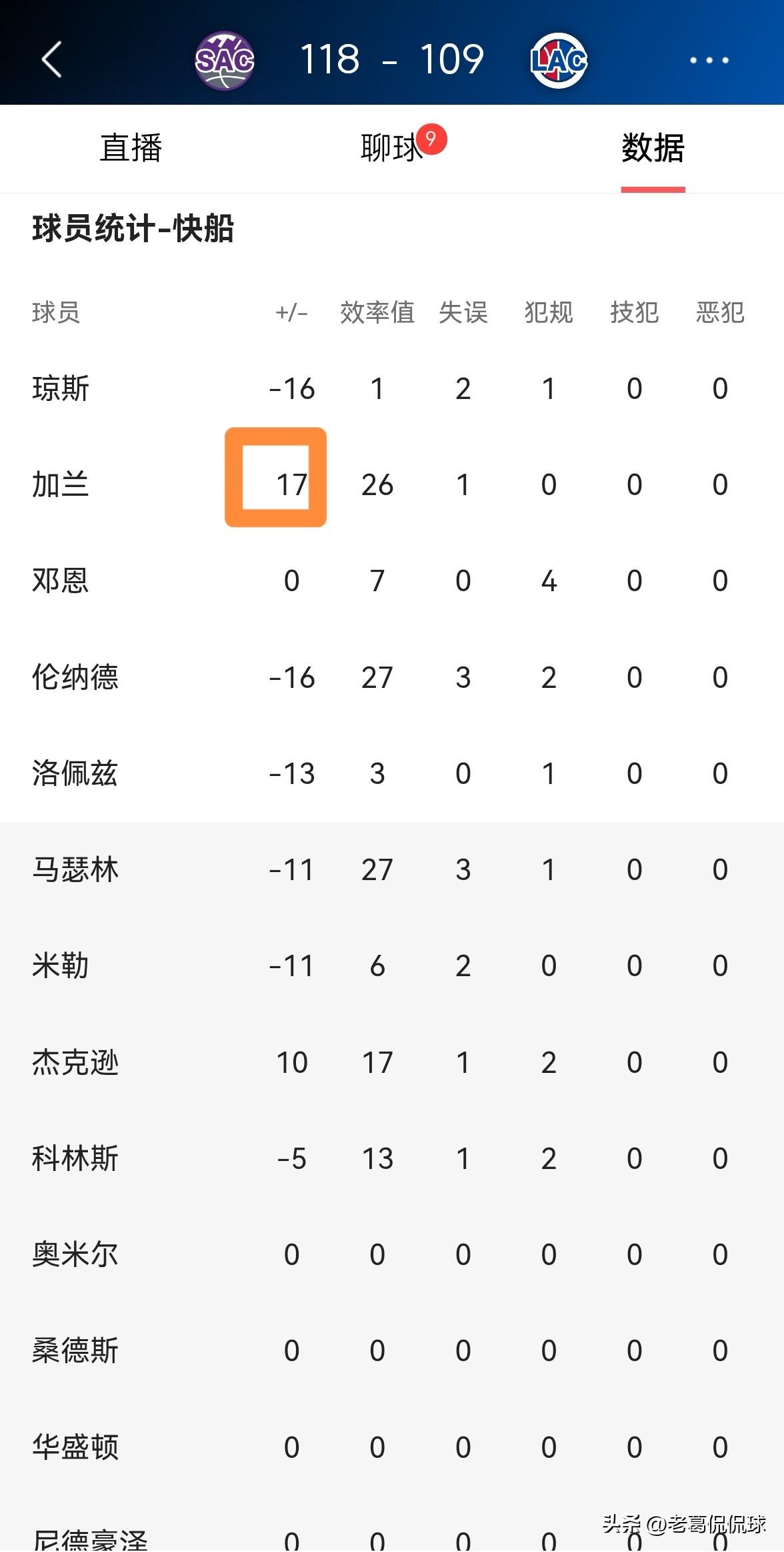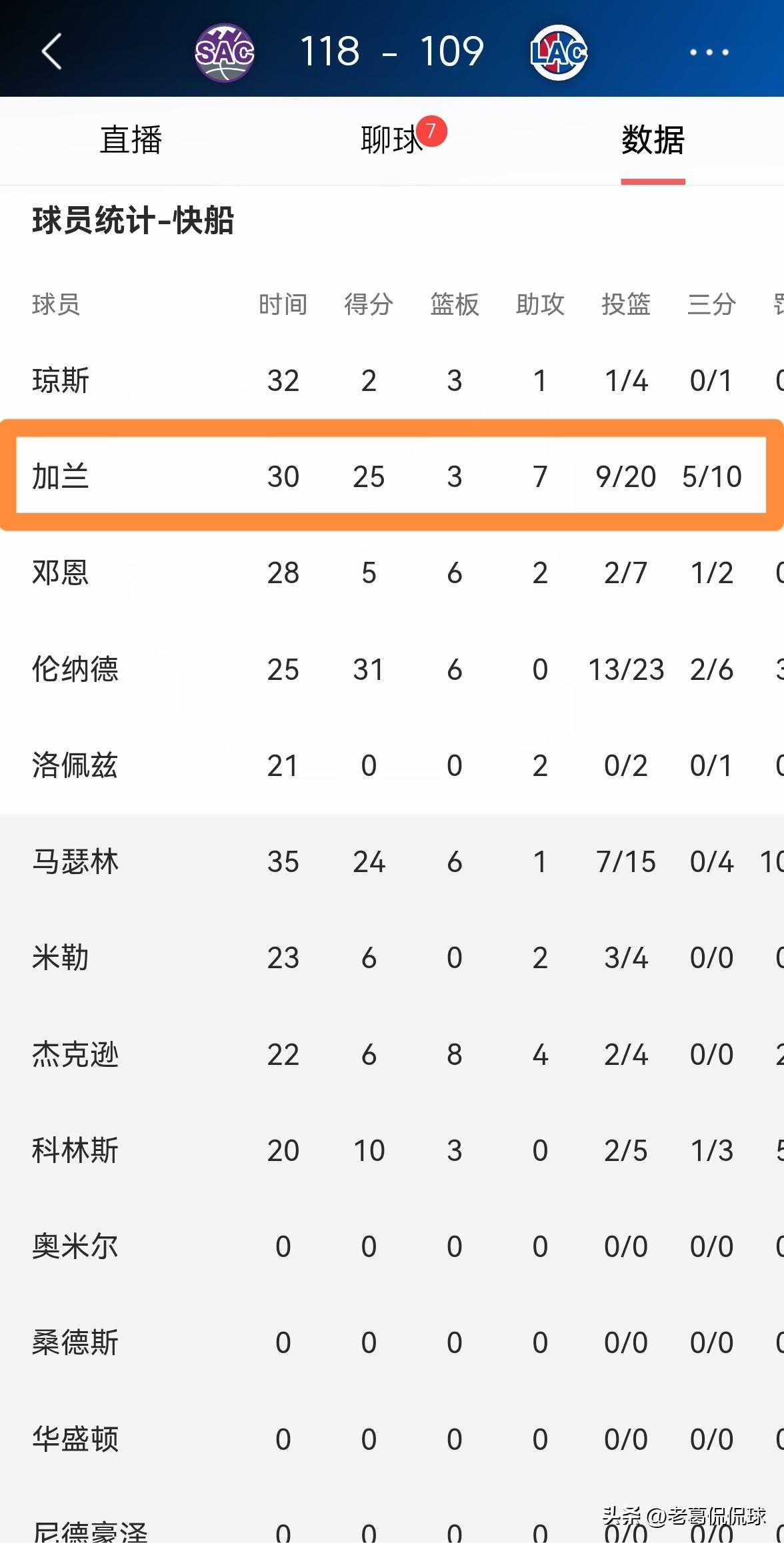 快船当家控卫加兰真是倾其所有了!虽然今天快船在主场以109:118输给了国王,但是加兰在攻防两端都倾其所有,尤其是在当家球星伦纳德因伤提前退赛以后,加兰带领球队一度看到了赢球的希望。 整场比赛下来,加兰首发出战30分钟,投篮20中9,其中三分球10中5、罚球2中2砍下25分3篮板7助攻,仅有1次失误,他的场上正负值为球队最高的+17。 随着伦纳德的伤退,加兰恐怕要在接下来的比赛中单核带队了,对加兰的真正考验即将来临。