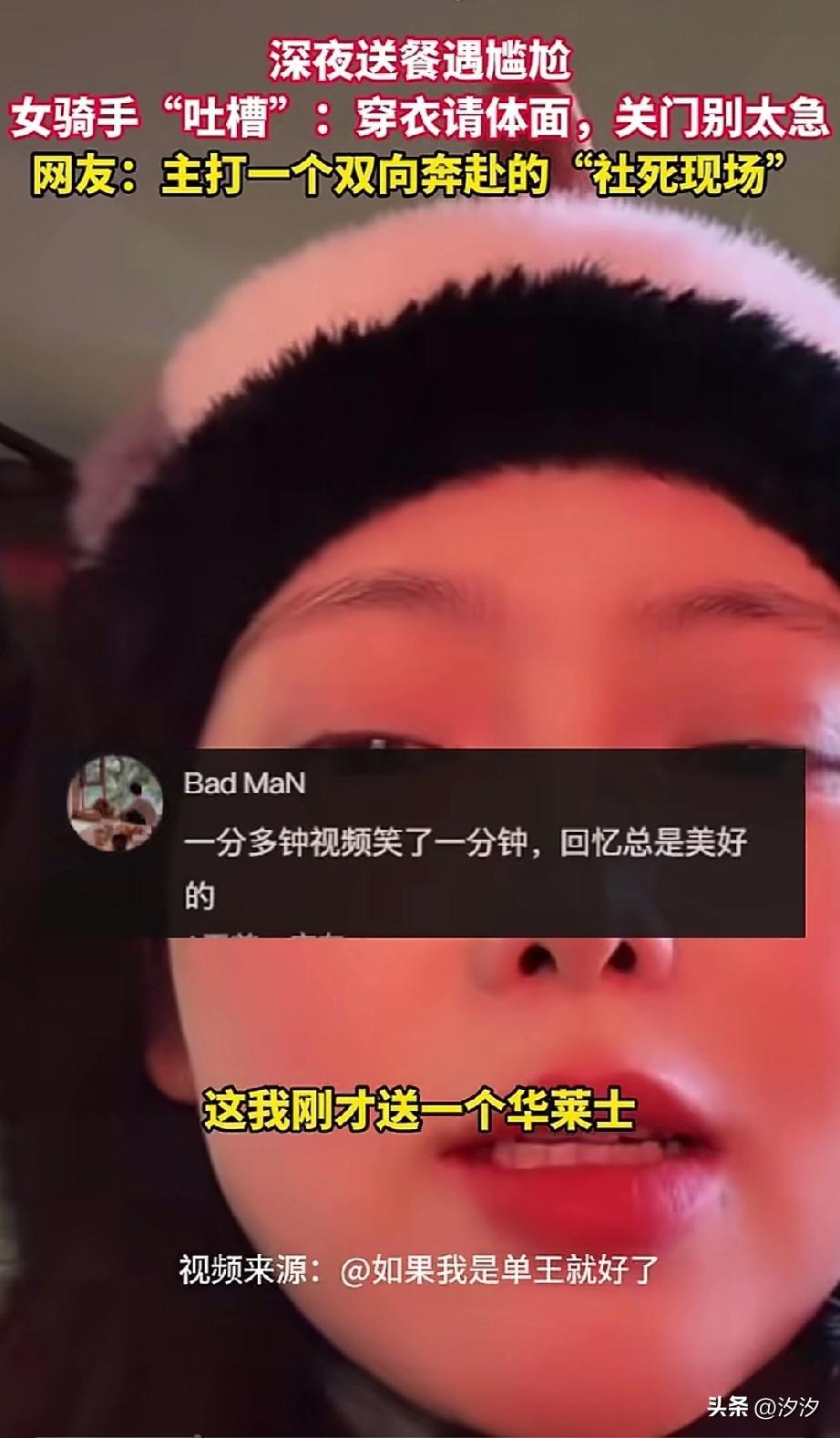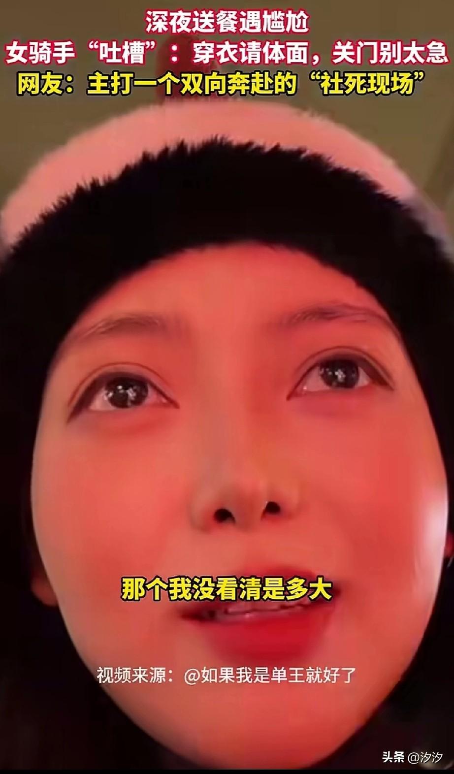 吉林大姐半夜去送外卖, 送了一个汉堡和可乐, 结果没想到, 顾客穿着裤衩子就接外卖, 见到她是个女的, 给她吓了一跳, 不好意思的用手通过门缝取外卖, 速度超级快, 大姐吐槽的, 自己都没看清楚呢, 不知道对方年龄, 就那么嗖的一下拽走了, 差点把她手给夹了, 不过看她那表情, 仿佛有点儿享受的感觉, 她把自己的这段经历发出来, 吐槽晚上接外卖的时候穿好衣服, 还有门不要关那么急, 没想到她的粉丝, 虽然说她是双向奔赴, 主要是她的表情把她出卖了, 这半夜送外卖的尴尬,谁懂? 现在的女外卖员也是极品, 因为都太搞笑了! 你会给外卖员道谢吗 外卖员女孩 外卖女客人 跑外卖女