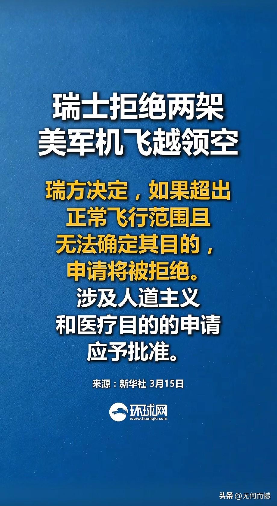瑞士这次挺硬气,竟然拒绝了美国两架军机飞跃领空的申请,难道瑞士这是吃了熊心吞了豹子胆不成?为啥敢硬刚美国?说白了,就是不想惹事!具体说来,主要有以下几个方面: 第一,“中立”是瑞士的饭碗,谁碰跟谁急。你想啊,瑞士能在欧洲活这么多年,没被大国吞了,靠的就是“中立”这块金字招牌。从1815年开始,人家就宣布“谁打架我都不帮”,一战、二战都躲过去了,连小胡子都没好意思动手——毕竟打中立国,道义上站不住脚,还得被全世界戳脊梁骨。这次美国、以色列跟伊朗在中东打得热火朝天,瑞士直接把这事儿定性为“交战状态”,掏出《中立法》就往桌上一拍:“看见了吗?法律写得明明白白,跟战争沾边的军事飞行,一概不许过!” 说白了,这就像你家邻居俩口子打架,你本来在旁边嗑瓜子看热闹,结果其中一个喊你“过来帮我递个砖头”,你能答应吗?肯定不能啊!帮了这个,得罪那个,最后自己家玻璃还得被砸。瑞士就是这个理儿:我中立,我安全,我赚钱,谁也别想拉我下水。 第二,美国这事儿办得太“鸡贼”,瑞士一眼就看明白了,你瞅瞅美国申请的是啥?侦察机!这玩意儿可不是运输机,屁股后面挂着的全是“眼睛”,飞过去就是为了盯着伊朗的动静,给美军递情报的。瑞士人精着呢,心里门儿清:“你这哪是正常飞啊?分明是想借我的地盘,给战争添柴加火!”更有意思的是,瑞士还留了后手:跟战争无关的飞机,比如运点人道主义物资、修飞机的,人家照样批准;可你这侦察机明摆着是来“搞事情”的,那必须给你怼回去。这就像有人跟你说“借你家厨房用用,我就煮个泡面”,结果你一看他手里揣着火锅底料和啤酒,那你能让他进吗?肯定不能啊! 第三,瑞士也怕“引火烧身”,不想当炮灰。别看美国平时跟瑞士称兄道弟,真到了节骨眼上,谁管你死活?伊朗的导弹可不是吃素的,要是美国侦察机从瑞士领空飞过去,伊朗一怒之下,说不定把导弹往瑞士方向甩——到时候瑞士躺着也中枪,好好的巧克力工厂被炸了,手表作坊被掀了,那多亏啊!而且瑞士人心里也有数:美国这几年到处挑事,今天制裁这个,明天打那个,信誉早就碎成渣了。之前还跟瑞士闹过关税矛盾,差点把人家的出口生意搞黄。现在想让瑞士当“战争跳板”?门儿都没有!这就像你之前被一个人坑过钱,现在他又来找你借车,说要去跟人干架,你能借吗?借了就是傻子!