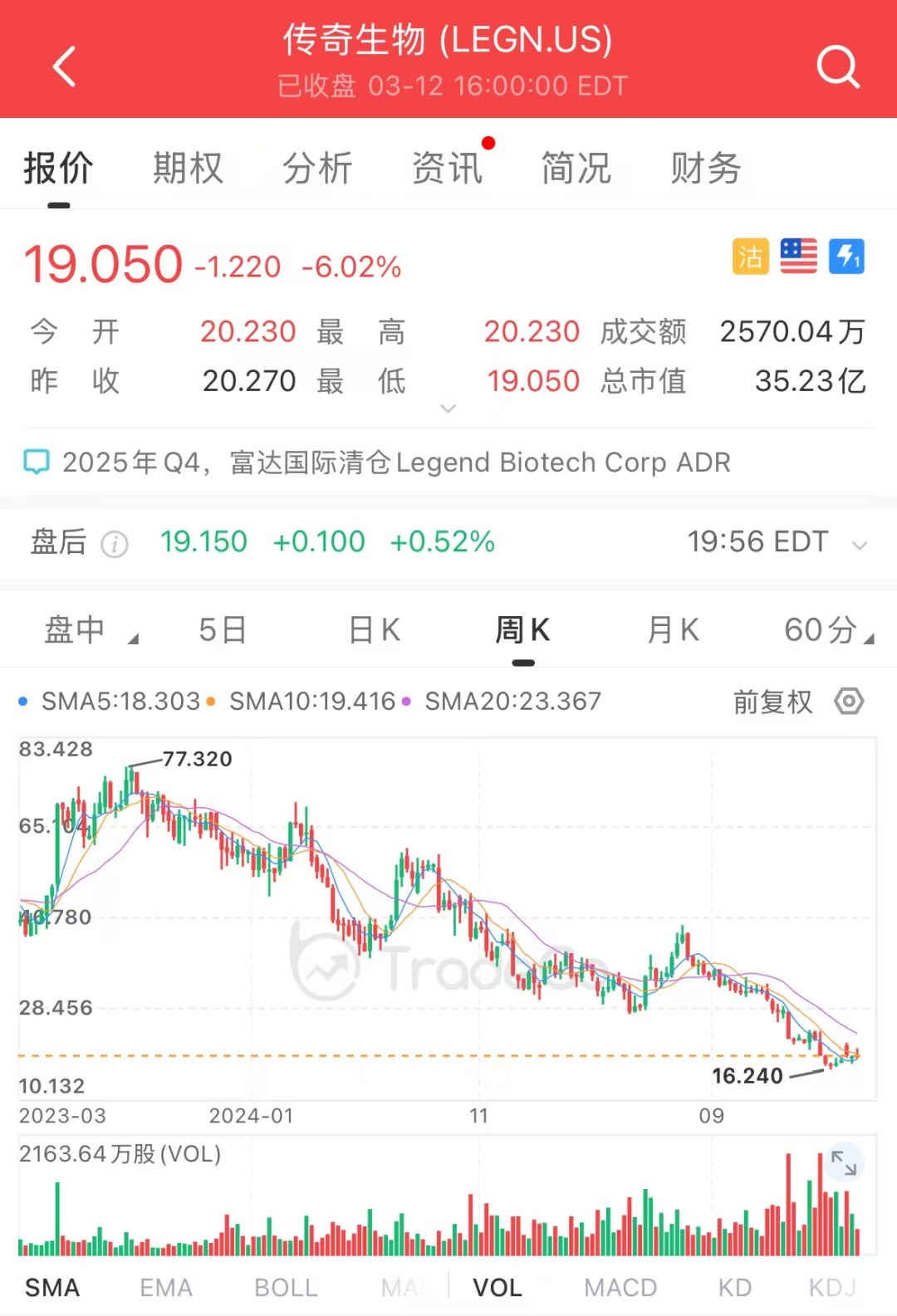 传奇生物股价自2023年7月份以来已累跌超75%。