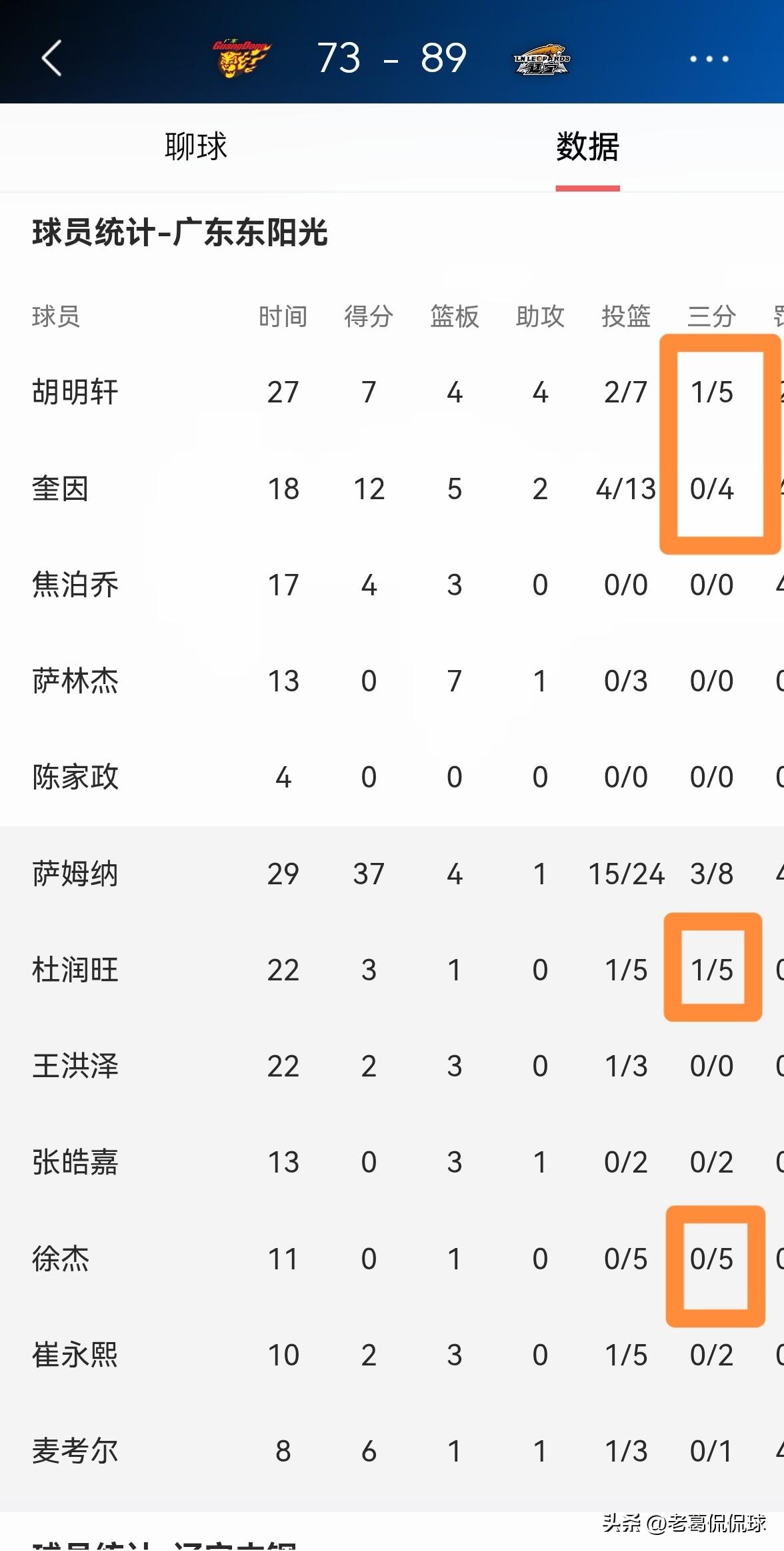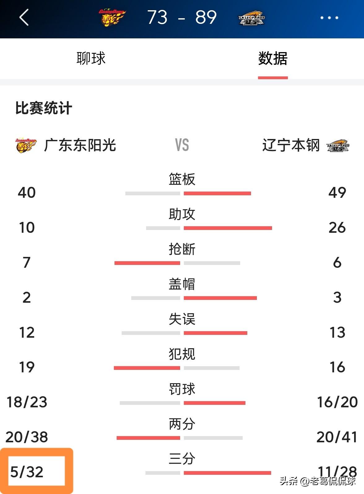 广东东阳光的三分球命中率真是低的吓人!今天广东东阳光在主场以73:89惨败于辽宁本钢,值得一提的是,本场比赛广东东阳光三分球合计32中5,三分球命中率仅有可怜的15.6%,其中胡明轩三分球5中1、奎因三分球4中0、杜润旺三分球5中1、徐杰三分球5中0,四人三分球合计19中2。 实事求是的说,广东东阳光之所以会在主场吞下一场惨败,其中最重要的原因就是球队在三分线外的表现过于糟糕,本场比赛辽宁本钢比广东东阳光多投进了6记三分球,这在现代篮球比赛中绝对是一个非常大的差距。