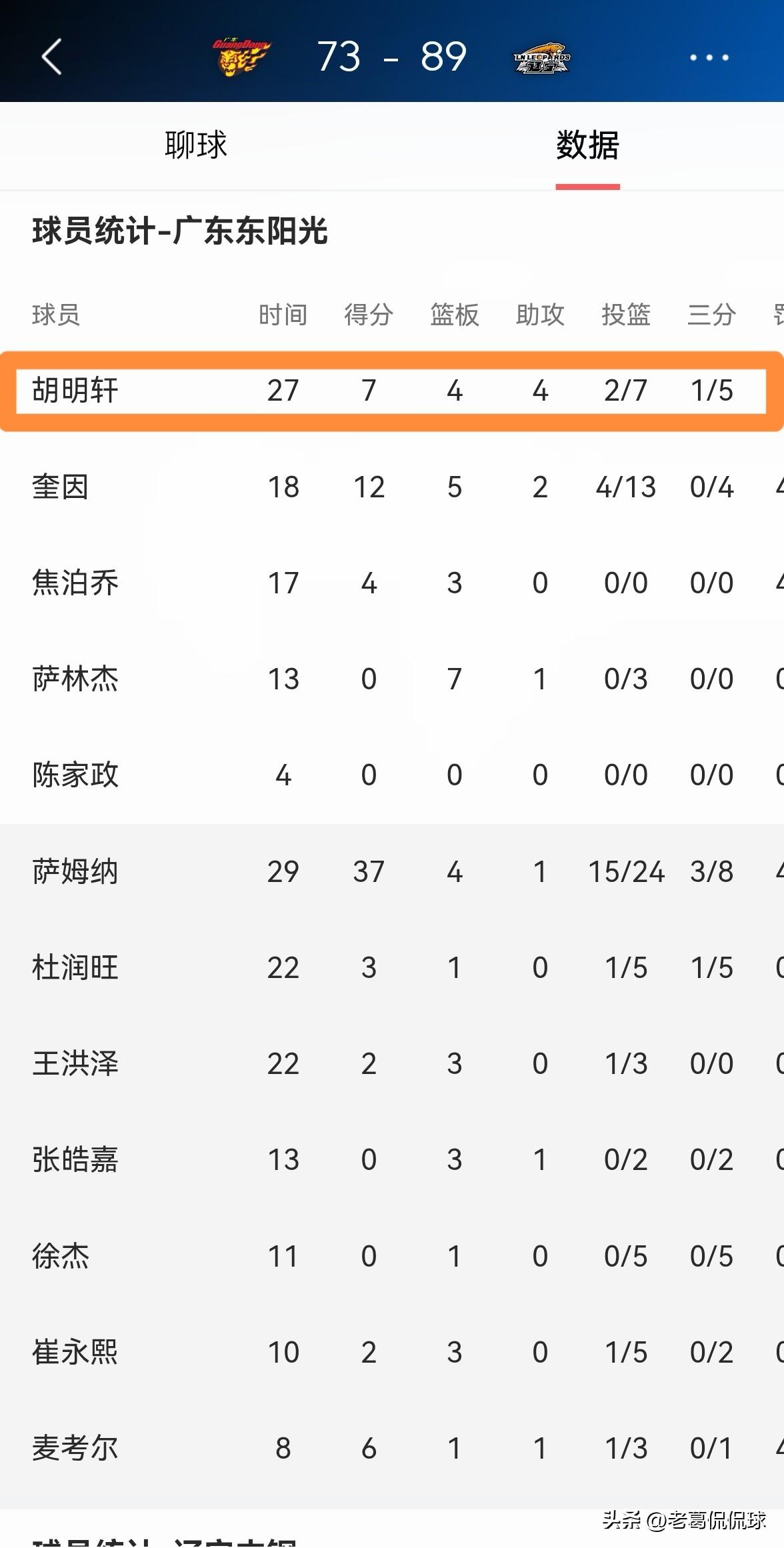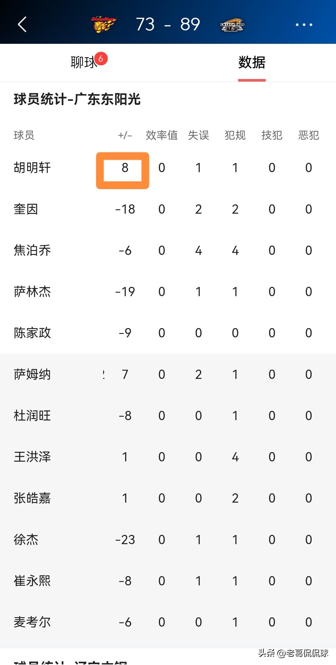 广东东阳光球星胡明轩真是太让人费解了!在今天广东东阳光主场以73:89输给辽宁本钢的比赛中,胡明轩在投篮端的表现非常低迷,但是让人感到非常费解的是,胡明轩的场上正负值竟然高达+8。 整场比赛下来,胡明轩首发出战27分钟,投篮7中2,其中三分球5中1、罚球2中2得到7分4篮板4助攻1抢断,他的场上正负值为全队最高的+8。 胡明轩在球队惨败于对手并且自身表现不佳的情况下,他是怎么做到让自己的场上正负值这么高呢?对此,我真是百思不得其解。