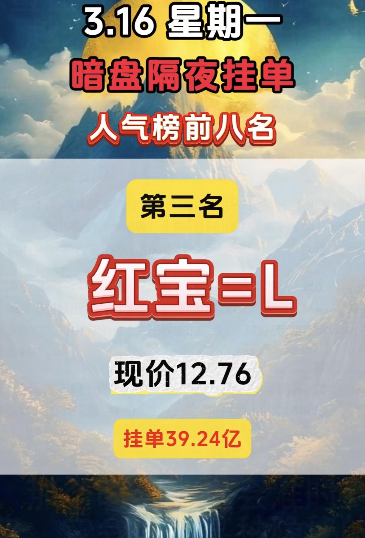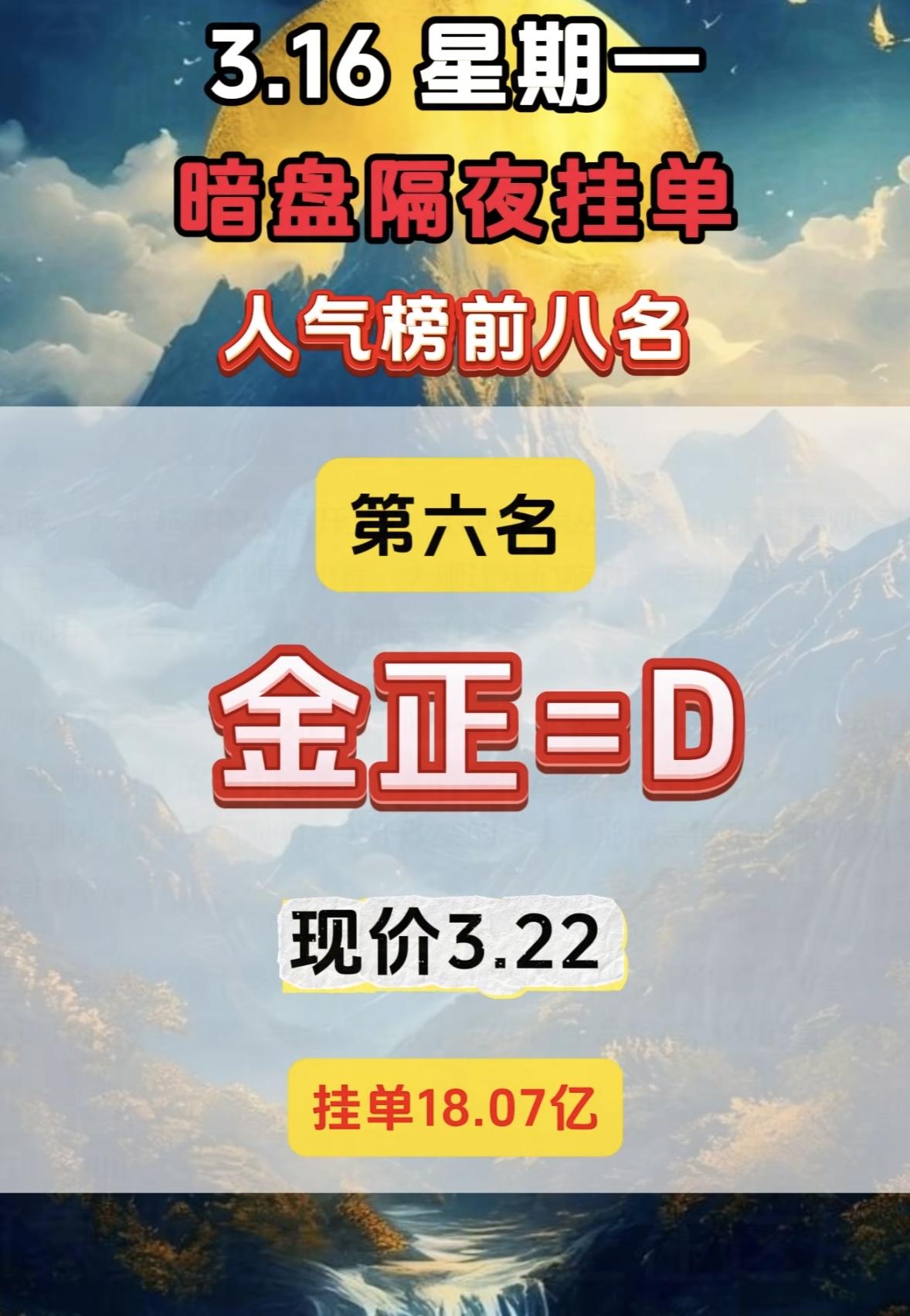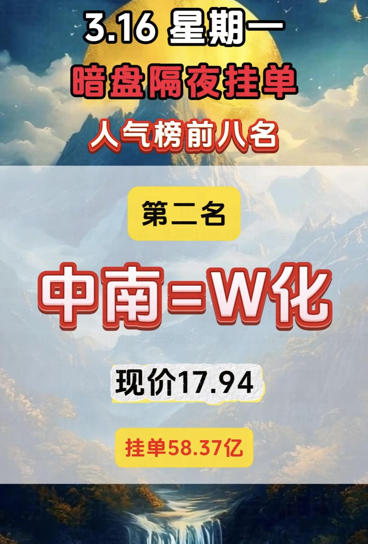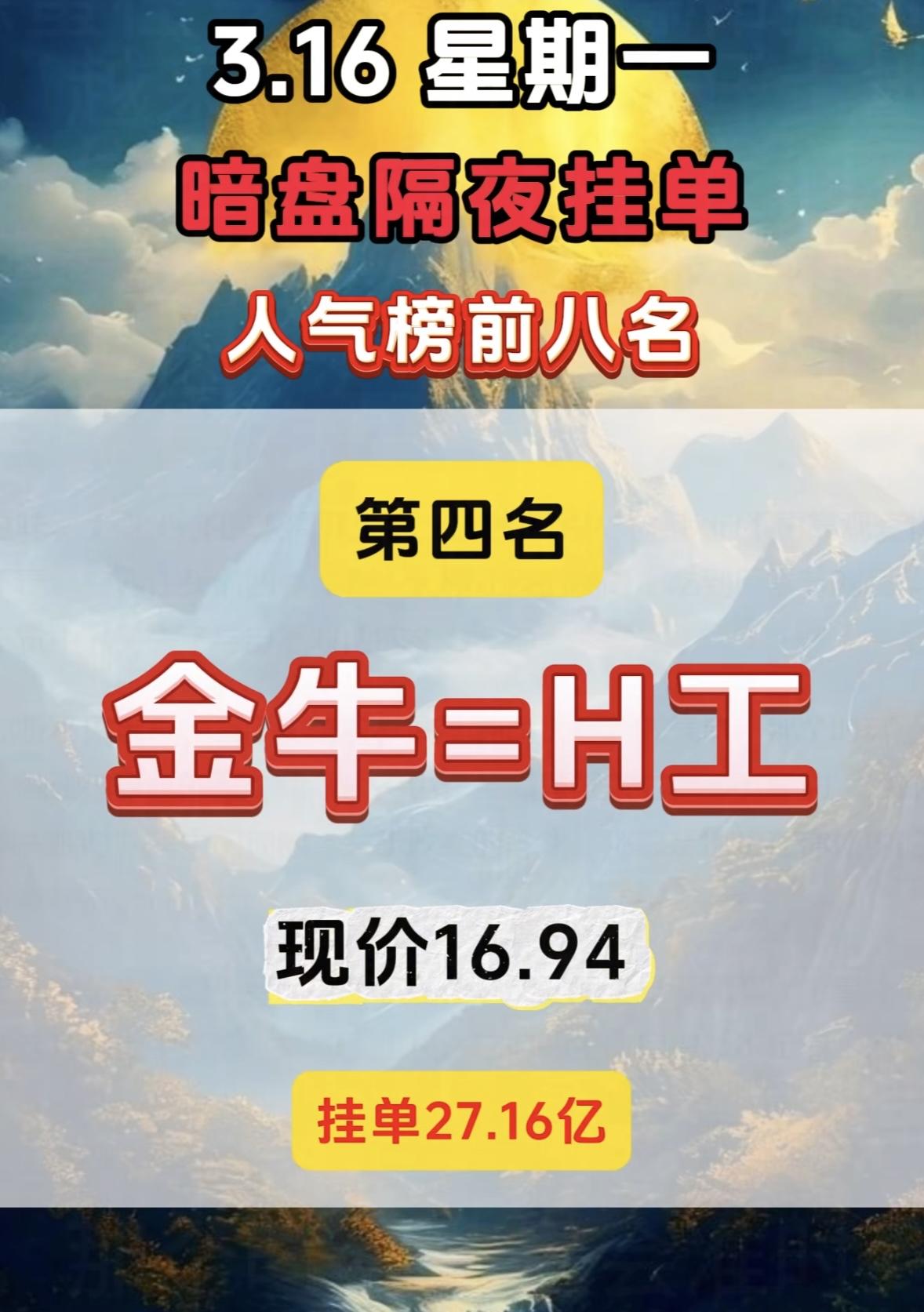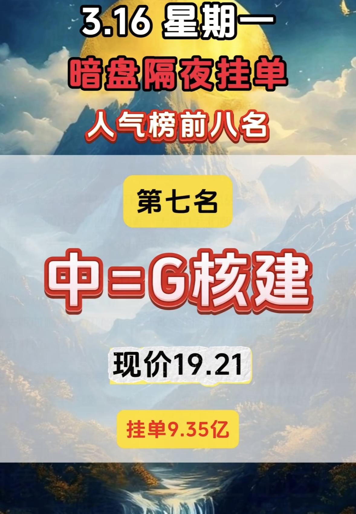 3月16日暗盘隔夜挂单人气榜前八挺有看头。 中国核建现价19.21,挂单9.35亿,而在完整排名里它排第四,买单81.74亿,卖单17.65亿。第一名中国电建,现价7.29,买单高达113.21亿。电建在电力工程建设领域布局广,新基建和能源建设政策红利让资金看好其长期业务拓展。核建也不简单,核电建设是清洁能源重要分支,全球对低碳能源需求提升,资金关注它反映出对核电领域长期发展的预期。这暗盘挂单里藏着不少市场信号呢。