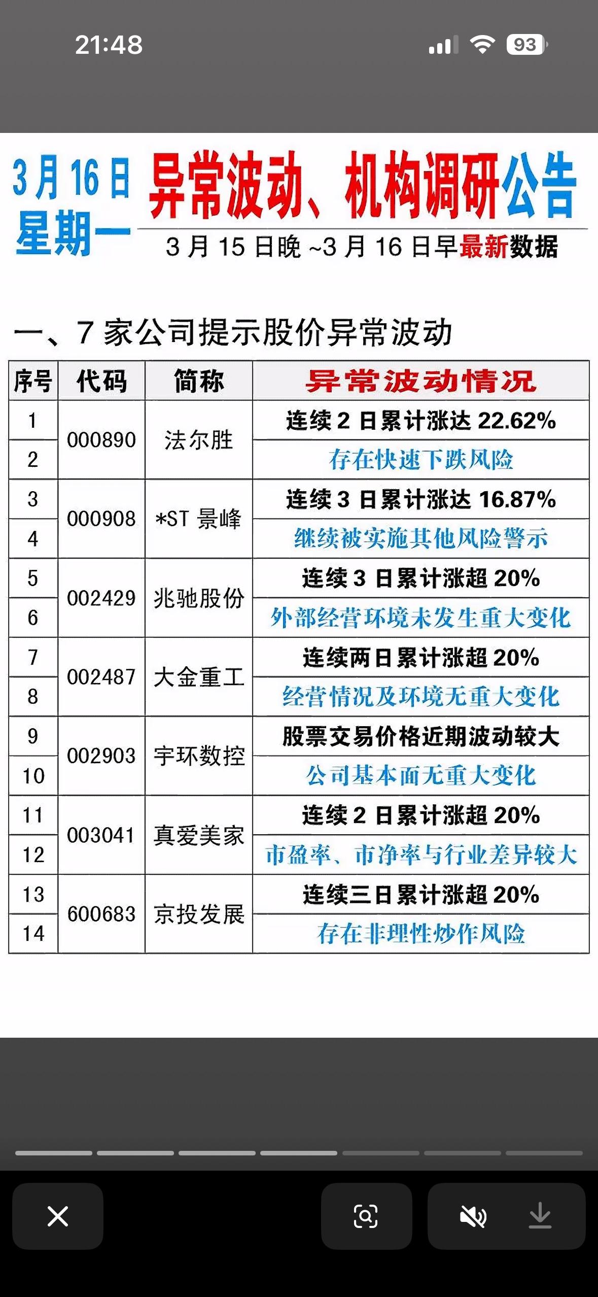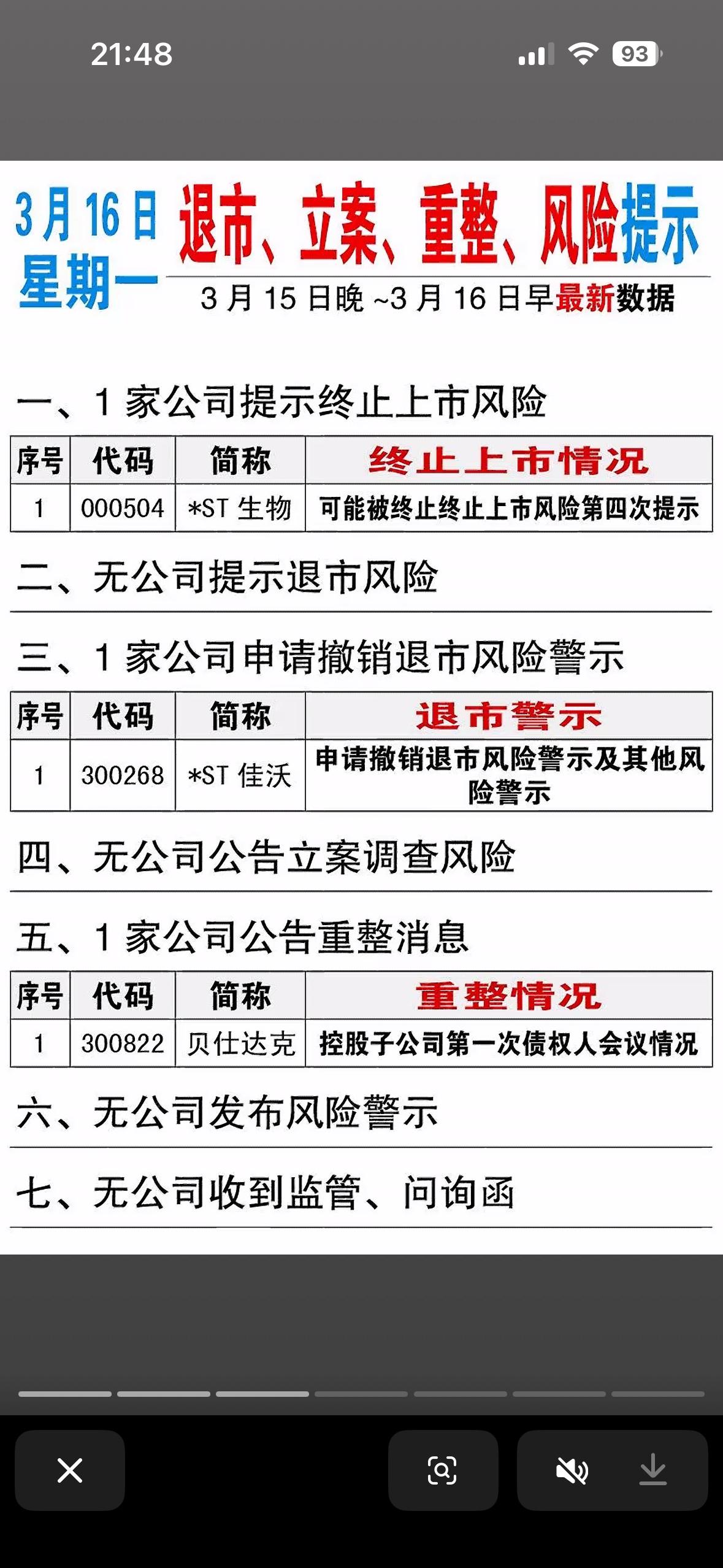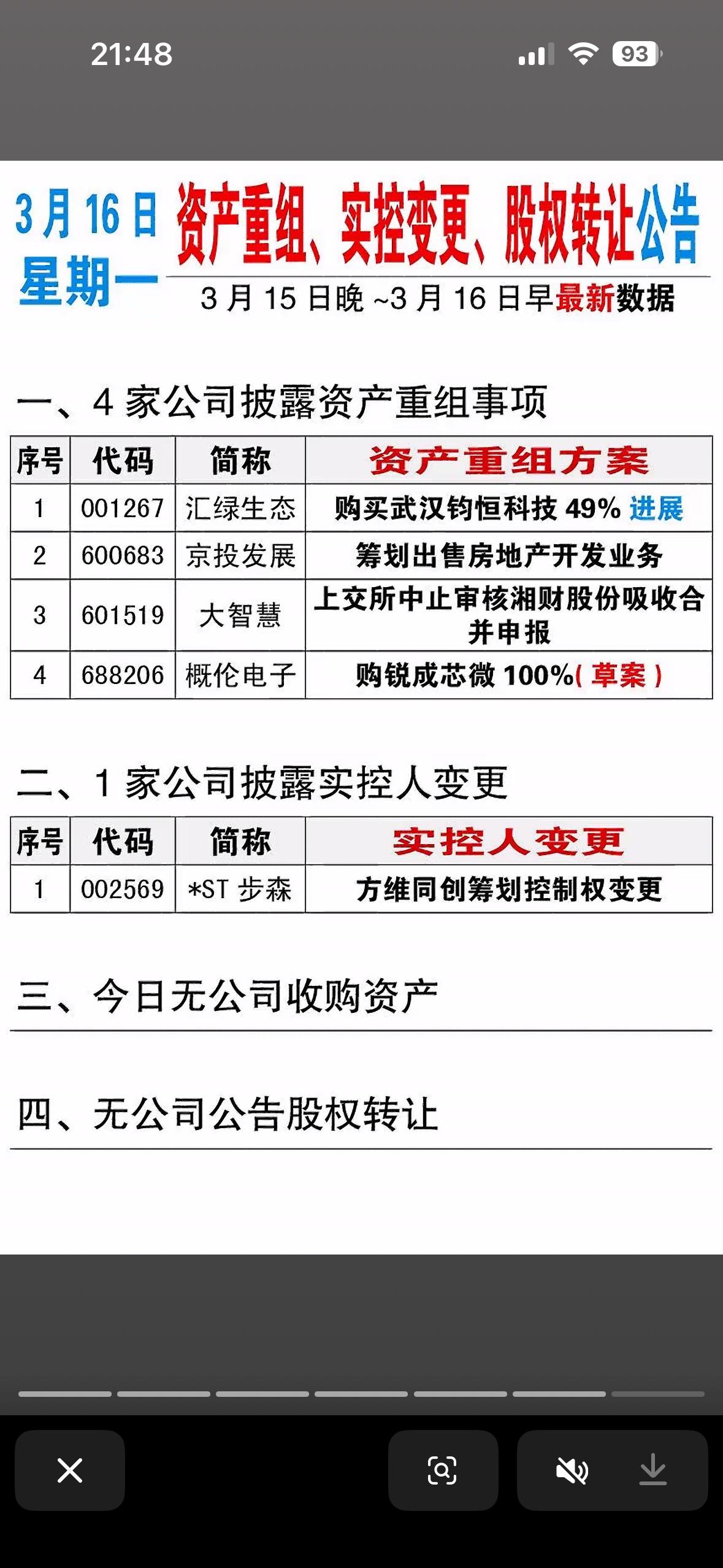 3月15日减持、增持、回购、立案、退市等个股公司一览表。 今日的公司公告有点热闹啊!一下子有4家公司搞资产重组,这可是大动作。资产重组往往意味着公司要重新整合资源,说不定能让企业脱胎换骨,迎来新的发展机遇。比如有的公司通过资产置换,把不良资产置换成优质资产,业绩可能就蹭蹭往上涨。 还有1家公司实控人变更,这也会给公司带来很大的不确定性。新的实控人可能会带来新的战略和管理模式,就像给公司换了个“掌舵人”。不过,这也得看新实控人的能力和规划,要是搞得好,公司说不定能蒸蒸日上;要是没弄好,那可就麻烦了。不知道这几家公司后续会有怎样的发展,挺让人期待的。