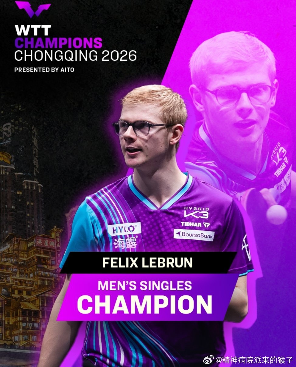 菲利克斯勒布伦获得2026WTT重庆冠军赛男单冠军的夺冠之路🏆决赛:4比1温瑞博🇨🇳(5,8,-9,7,11)半决赛:4比3松岛辉空🇯🇵(-7,8,-9,-11,6,6,6)¼决赛:4比3卡尔德拉诺🇧🇷(-10,9,-10,-10,8,11,11)R16:3比0安宰贤🇰🇷(4,7,10)R32:阿鲁纳🇳🇬(5,6,3)温瑞博vsF勒布伦