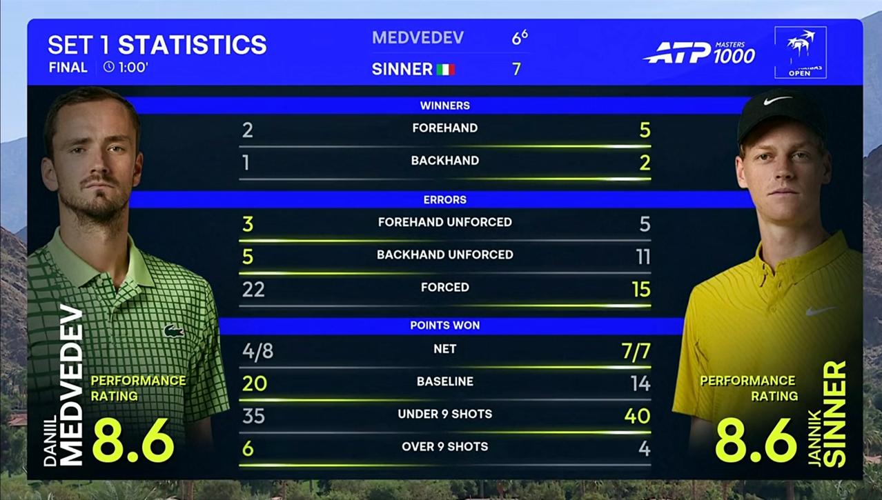 辛纳在印第安维尔斯大师赛决赛中赢下第一盘 北京时间2026年3月16日早上,印第安维尔斯大师赛决赛,辛纳对阵梅德韦杰夫。 第一盘,前十二局,两人各自坚守住自己的阵地,将比赛拖到抢七。抢七中,辛纳以8:6的比分险胜。 技术统计显示,两人各有千秋,总体不分伯仲。 值得一提的是,辛纳一发得分率高达96.55,比梅德韦杰夫高出21个多百分点。