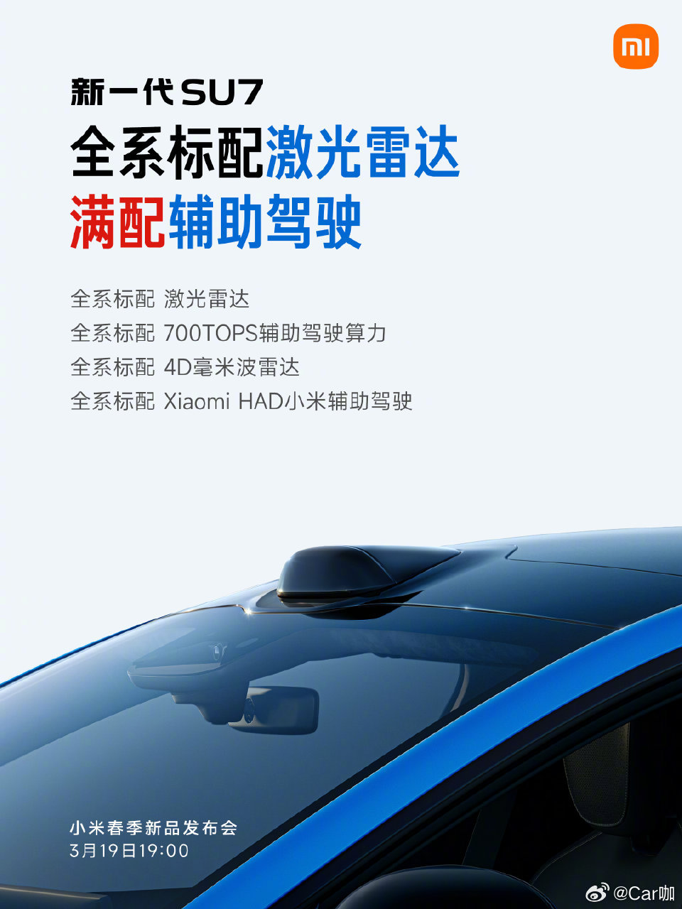 小米新SU7发布定档3月19日全系标配拉满,续航、电机、底盘、激光雷达、安全配置全给到位,Pro版直接干到902km续航,没有丐版,不玩套路。