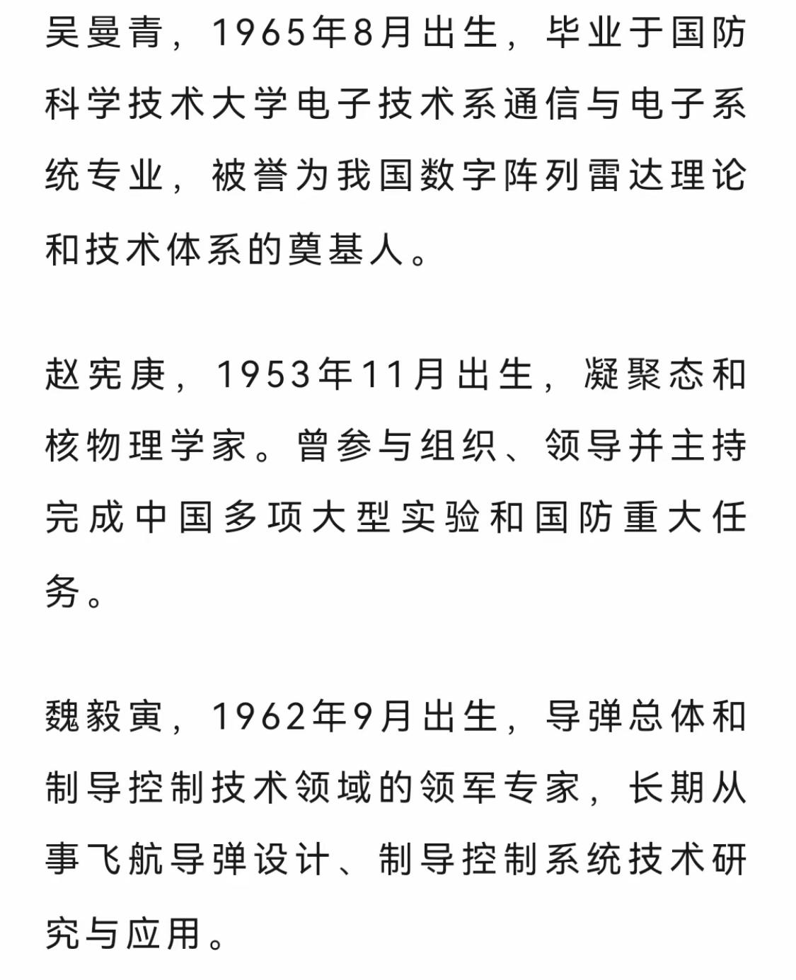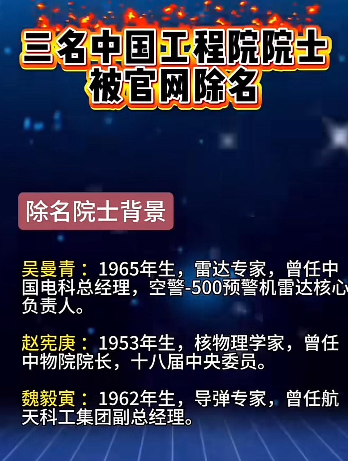 可能不是小事情!一天之内三名军工系统内的院士被除名,这真是不敢让人细想!3月15日,根据国内媒体报道,本周,中国工程又有三名院士被官网除名。这三人分别是吴曼青、赵宪庚、魏毅寅。 名单一更新,工程院官网的总数直接掉到了989人。这可不是简单的页面维护,而是白纸黑字按章程办事。第二十二条写得明明白白,只要涉及触犯法律或者危害国家利益,称号必须撤销。这说明院士头衔早就不是铁饭碗了,犯了错一样得摘帽子。 这三位可不是普通搞研究的,都是曾经手握重权的核心人物。吴曼青管雷达,赵宪庚搞核物理,魏毅寅负责导弹制导。他们仨几乎把国防的关键领域都占全了,这种级别的人同时被除名,在工程院的历史上绝对是头一回。 翻翻旧账,从李宁到曹耀峰,这几年被除名的院士已经超过十个了。这次三个人一起消失,官方既没发讣告也没说健康问题,那基本就指向了纪律审查的结果,肯定是出了大事。 现在国家强调科技自立自强,这种净化其实是在释放信号。不管以前功劳多大,只要现在品行不端或者触碰红线,最高荣誉也得收回。这等于告诉所有人,院士是荣誉不是护身符,必须得干干净净。 说到底,这么做的目的还是为了把科研生态搞干净。把不符合标准的人清出去,不是否定他们的技术,而是为了维护国家科技力量的公信力。只有打破那些学术山头,才能让年轻人看到希望,真正回归学术本身。 军工系统太特殊了,容不得半点沙子。对于这些顶尖专家,学术能力、政治定力和廉洁自律必须绑在一起。工程院这次出手这么果断,就是在死守国家安全的底线。 就拿去年罗琦院士的事来说,他刚被罢免全国人大代表,工程院这边立马就把他从名单里拿掉了。这种联动机制说明,只要在纪律上出了问题,学术荣誉根本保不住。这次三个人同时被处理,力度比之前更大,也说明规矩越来越严了。 此次事件再次印证,在国家安全与科技伦理面前,没有任何个人可以例外。军工系统的特殊性决定了其从业人员必须接受比普通行业更严苛的纪律约束。对于身处敏感岗位的科研管理者而言,学术能力与政治定力、廉洁自律必须三位一体,缺一不可。工程院的果断出手,正是对国家科技安全底线的坚决捍卫。中国科研院士