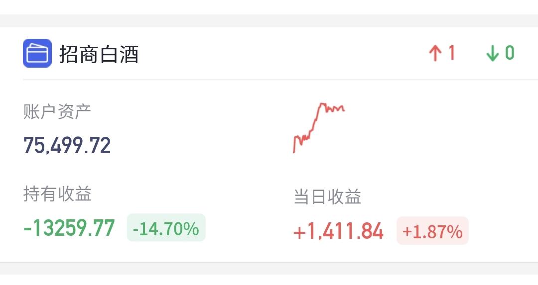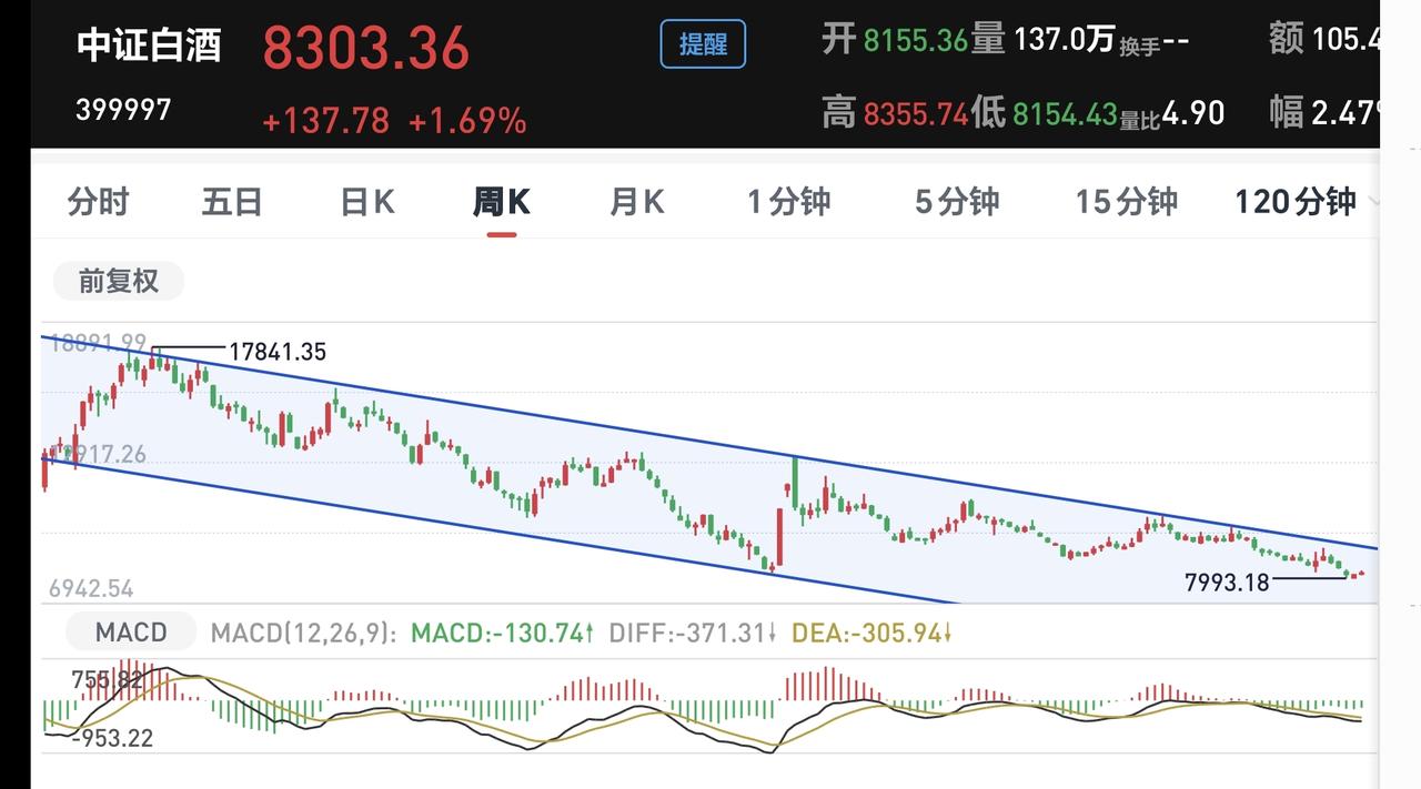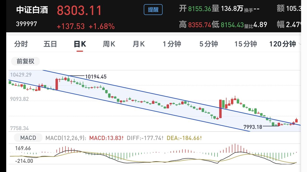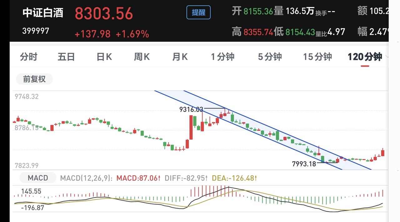 基金:白酒板块大涨了,为什么并没有开心 市场上涨幅度最大的三个板块是:创新药板块,大消费板块,白酒板块,白酒板块现在盘中估值上涨了1.26%,是连续第二个交易日上涨,持有人数在所有板块当中排名第17位。 看下面的截图2,这是白酒板块120分钟K线图,这个板块前段时间上涨突破了120分钟级别下跌通道的上轨线,今天是继续上涨,现在是处于有效突破中,短线持有的人可以继续持有。 看下面的截图3,这是白酒板块日开线图,上周五上涨突破了日线级别短期下跌通道的上轨线,今天是继续上涨,如果明天还能保持上涨状态,日线级别短期趋势有可能被改变,也就是日线级别短期的下跌趋势有可能被改变。 看下面的截图4,这是白酒板块周K线图,这个板块现在还处于周线级别下跌通道中,距离下跌通道的上轨线还有一段距离。也就是说,这个板块真正的反转还需要一段时间,这个板块真正的反转还需要上涨突破周线级别下跌通道的上轨线,只有突破了周线级别下跌通道的上轨线,这个板块的下跌趋势才能被根本改变。 持有的白酒板块基金盘中估值上涨了1.87%,持有金额75527元,持有亏损14656元,持有亏损率16.32%,累计亏损4321元,每天定投200块钱。 我经常说,我不愿意这个板块很快上涨,许多人认为是玩笑话,其实,我说的是真心话,持有基金的起涨最好是在满仓的时候,刚刚满仓的时候起涨是最好,这个板块的基金,我的满仓目标是10万块钱,现在还没有满仓,如果现在就起涨,就稍微早了一点,但现在又不是可以手动满仓的时候,因为大盘的方向没有确定,这个板块周线级别趋势还没有反转,只能是选择定投,只能是把定投的额度增大一些,我就是把前段时间每天的10块钱,调整为了现在的每天200块钱,在亏损16%左右的情况之下,我每定投进去200块钱,就等于是挣了32块钱,因为这个切入的成本比我的平均成本低了32块钱。 白酒板块涨了,我并没有开心,现在已经做到了涨不喜跌不悲,市场的涨跌根本影响不了我的情绪,有时候反而认为,跌下来是给我们的机会,我们每年只要等到一两个大跌的机会,我们每年只要抓住一两个大跌的机会,我们的财富大概率会稳步增长。 花1秒钟点赞,花30秒钟评论,就是对我最大的支持,谢谢大家的支持。