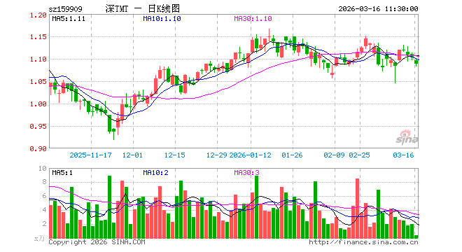 3月16日,截止午间收盘,TMT50ETF招商(159909)跌1.36%,报1.088元,成交额40.66万元。TMT50ETF招商(159909)重仓股方面,中际旭创截止午盘涨0.95%,新易盛涨1.01%,立讯精密跌1.89%,北方华创跌2.77%,胜宏科技跌0.95%,京东方A跌2.75%,中兴通讯跌1.59%,海康威视跌0.66%,东山精密涨3.43%,沪电股份跌0.52%。