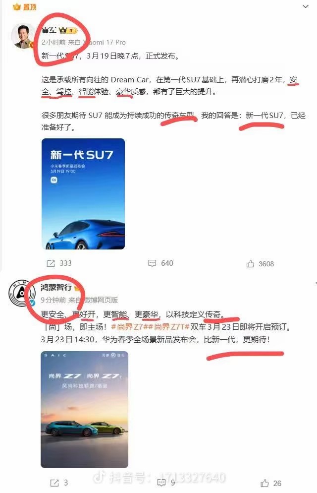 雷军刚发完新一代SU7官宣:3月19号见,核心卖点是安全、驾控、智能、豪华鸿蒙智行就马上跟上:文案把关键词改成“更安全、更好开、更智能、更豪华”,连句式都照抄,最后还补一句“比新一代,更期待”这就是公开宣战小米SU7是目前20-30万级纯电轿跑绝对的流量之王,鸿蒙智行带着尚界Z7,是直接踩着小米的卖点大喊“我比你更强”没有遮遮掩掩,没有暗戳戳拉踩,就是明牌给你小米下战书!小米3月19号开发布会,鸿蒙智行把自己的会定在3月23号——刚好差4天。等小米SU7的热度炒到最高,用户还在纠结的时候,鸿蒙智行的发布会来了。本质就是抢注意力、截胡决策,把小米的流量直接导到自己的新品上。很多人骂华为这样做不够体面,但我倒觉得这是好事小米要守住SU7的爆款地位,鸿蒙智行要靠尚界Z7/Z7T撕开市场,接下来配置、价格、权益必须往死里卷最终受益的,永远是我们这群掏钱买车的人。鸿蒙智行这条微博,没有情怀,没有鸡汤,只有最赤裸的商业逻辑——借你的势,打你的脸,抢你的用户。3月19号小米SU7,3月23号尚界Z7,要你选,你买哪台车?