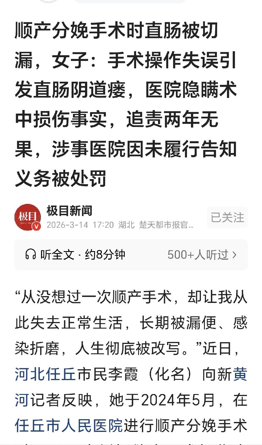 “太可怕了!”河北任丘,一女子生完孩子,3天之后,从阴道排出大便,女子急了,这才知道医生在她生孩子时侧切,直肠被切漏,可医生隐瞒真相,没采取任何措施,从而导致了直肠阴道瘘,可女子感染严重,错过了最佳治疗期,女子漏气漏便,穿纸尿裤,靠输营养维持身体,女子找医院理论,医院推诿敷衍,涉事医生还在继续接诊看病,啥事没有,女子急了,多方投诉,卫健部门的答复令她崩溃了。 产房里的针线,本该缝合伤口,却刺穿了一个29岁女人的后半生。 2024年5月14日,李霞在河北任丘的医院顺产生下孩子。历经分娩与术后处理,医生告知她**母子平安**,并细心嘱咐她术后暂时只能食用流质食物。她以为这是常规医嘱,乖乖照做。护士每天来换药,一切看起来都很正常。 直到生产后的第三天,她在起身如厕时,才察觉到身体出现了异常情况。 那一刻,李霞的魂儿都吓飞了。她急忙走到医生面前,医生这才告知实情:在进行侧切缝合过程中,针线不慎穿透了直肠黏膜。医生当时就发现了,还偷偷拆掉了部分缝线,但谁也没告诉她。 病历上白纸黑字写着"缝针穿透直肠粘膜",出院记录里也明明白白标注了"直肠阴道瘘",可李霞从头到尾被蒙在鼓里。那三天的流食要求,不是为了她好,是为了延缓粪便排出,给医院争取掩盖时间。 三天,72小时,黄金修复期就这么被耗光了。 李霞被紧急转院,第一家医院看到伤口直接摇头——重度感染,烂得不成样子,不敢收。再转到上级医院,医生说直肠下段破了个指尖大的洞,现在感染太严重,根本没法手术,只能先控制炎症。 整整一年,李霞都在跟感染作斗争。2025年,终于盼来了手术的机会,可最终还是未能成功。医生说,如果一直找不到敢接手的,她可能得在肚子上做个造口袋来排便。 现在的李霞,24小时离不开纸尿裤。她漏气漏便,哪儿都不敢去,生怕别人闻到味道。曾经开朗乐观的他,变得沉默寡言、不愿与人交流,身体状况也急剧下滑,只能依靠营养液维持,还患上了风湿疾病。29岁,本该是当妈后的新起点,却可能要终身背着造口袋活着。 医疗费砸进去十多万,李霞找医院讨说法,对方除了推脱就是打哈哈。更让人心寒的是,那个闯祸的医生把她拉黑了,照样在门诊给别人看病,一丁点惩罚都没有。 李霞投诉到卫健部门。回复来了:医院被罚5万元,因为"未履行告知义务"。针对涉事医生的处理问题,当地卫健部门表示,依据相关规定已实行“一案两罚”,不再进行额外处置。 李霞想不通:医院和医生难道不是两码事吗?《医师法》第55条明明写着,医生隐瞒真实情况造成后果的,得警告、停职甚至吊销执照。但现实情况是,仅仅处罚医院,相关医护人员就能完全免责吗? 卫健局还说,医院之前想私下赔2万块钱了事,但家属没同意。李霞一家人全懵了——从来没接过这电话。 现在李霞只能走司法途径。《民法典》规定,医生有过错,医疗机构就得赔偿。可不管能赔多少医疗费、伤残金,都换不回她失控的身体和崩塌的人生。 一个低级失误,三天的隐瞒,毁掉的是一个女人的尊严和一个家庭的未来。而那个在手术台上"缝穿了"的医生,还在继续给别人接生。 参考信息:顺产分娩手术时直肠被切漏?女子追责两年无果,河北任丘一医院因未履行告知义务被处罚 2026-03-1415:54·新黄河