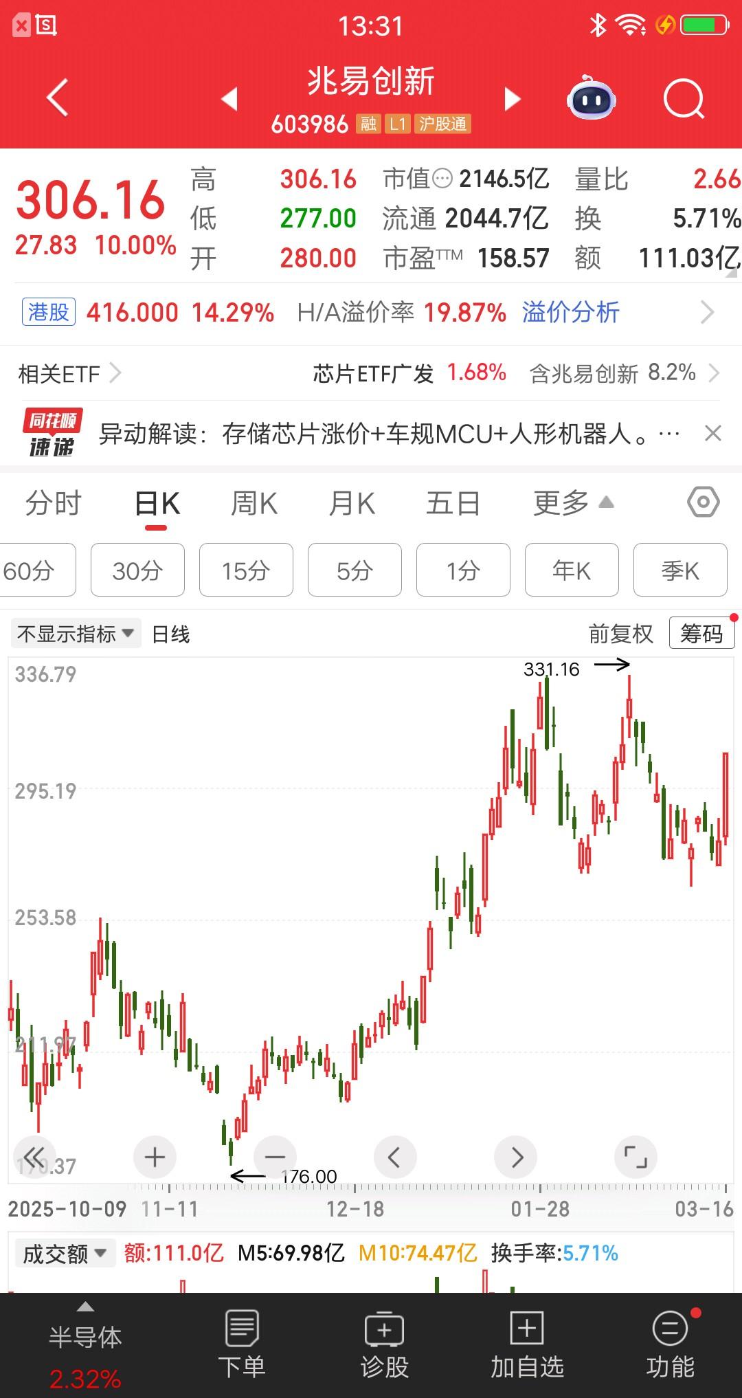 兆易创新封板资金30亿,成交额超百亿! 最新股价306元,对应市值2146亿! 是今天涨停股中封单金额最多的票! 开盘后股价震荡走高,此后快速拉升,最终成功封住涨停,整个过程比较顺利。核心炒作逻辑是,存储芯片涨价+车规MCU+人形机器人。日线看,股价处在历史高位,涨跌反复出现。切勿追高,以免山顶站岗。 2025全年业绩预告 - 营业收入:92.03亿元左右,同比+25% - 归母净利润:16.10亿元左右,同比+46% - 扣非净利润:14.23亿元左右,同比+38% - 基本每股收益:约2.44元/股 增长原因 - 存储周期上行,NOR Flash、利基DRAM价量齐升 - AI算力、AI PC、汽车电子需求拉动
