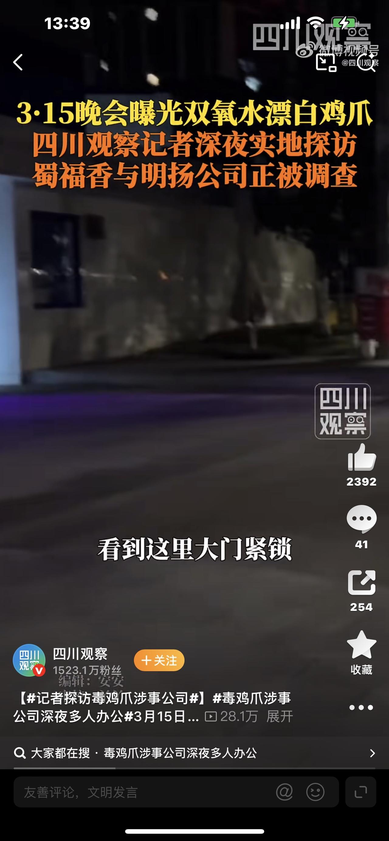 记者实地探访315毒鸡爪涉事公司!大门紧锁、查封贴满墙,现场太解气 315刚曝光双氧水漂白毒鸡爪,记者第一时间冲到涉事公司!大门被贴满封条、车间空无一人,成堆问题鸡爪全被扣押,看完只想说:查得好! 谁能想到,超市里白净脆嫩的网红凤爪,背后竟是这样的黑心工厂! 记者卧底两个月发现:车间没健康证、没消毒,污水横流、鸡爪直接扔地上被踩踏,扫帚铁锹压在食材上,工人自己都不吃。 为了卖相好看,商家违规用工业双氧水浸泡,发黄变质鸡爪一泡就雪白诱人,长期吃伤肠胃、损肝肾,严重还会致癌。 曝光当晚,市场监管雷霆出击:涉事企业全线停产、原料成品全查封,上游双氧水供应商一并被查,涉案数千箱毒鸡爪全部扣押召回,电商平台连夜下架,一个都跑不掉! 食品安全,从来不是小事。 好看的卖相,藏不住肮脏的底线;低廉的价格,换不回健康的身体。 泡鸡爪防腐剂 鸡爪消毒粉 鸡爪清洗方法 泡药水鸡爪 感谢记者冒险卧底,感谢监管从严查处!也提醒每一位消费者:入口食物别只看颜值,认准正规渠道,守住自己和家人的健康。 守住舌尖安全,就是守住万家安心!