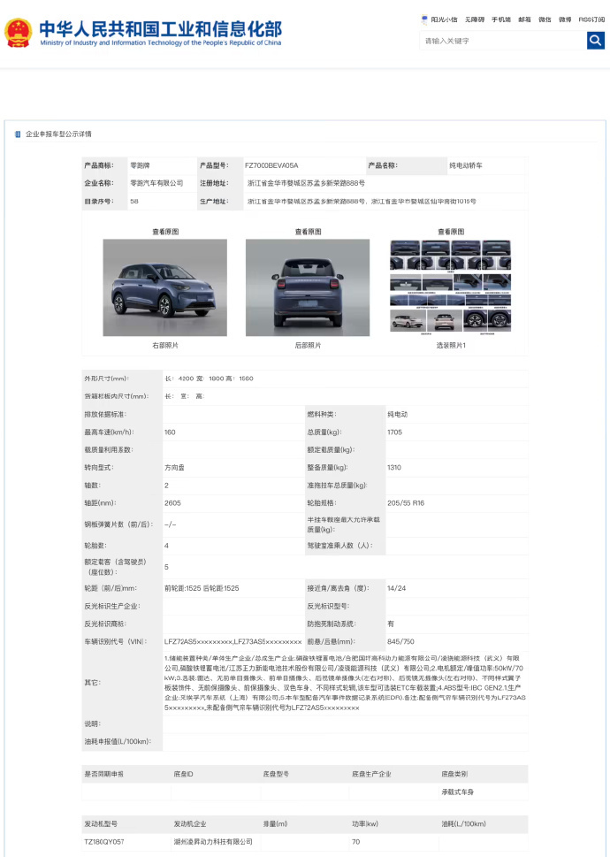 零跑全新纯电车型A05申报 3月13日,工信部公布第405批《道路机动车辆生产企业及产品公告》新产品公示,来自零跑的一款纯电小车A05首次亮相。