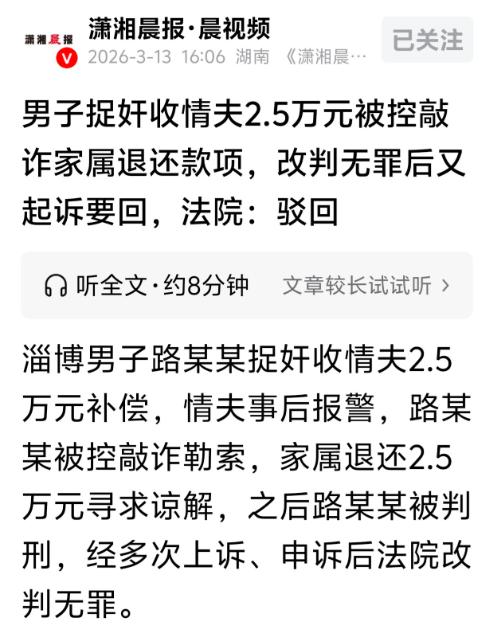 山东淄博,男子怀疑妻子有外心,就尾随去了酒店,男子叫开房门后,发现妻子和另一名没穿衣服的男人在房间内,妻子还穿着情趣内衣。男子拍视频留证,忍不住打了男人,妻子离开后,对方情知理亏主动提出补偿,男子索要6万,对方转账给他2.5万,男子临走又拿走了桌上的200元现金。不料,对方报警称男子敲诈勒索,男子被判有期徒刑6个月,并处罚金5000元。后经家人多次申诉,男子被改判无罪。出来后,家人起诉对方,要求返还2.5万,被法院驳回。 大概一年多前,陆某发现妻子变了,变得陌生又诡异。 以前下班就回家,眼里有活、心里有家,可后来,晚归成了常态,借口一套接一套,不是加班就是陪闺蜜,要么就是回娘家。 更可疑的是,她的手机常年调成静音,洗澡、睡觉都要带在身边,偶尔有电话进来,要么不接,要么躲到阳台、卫生间偷偷接,挂了电话还会刻意删除通话记录,生怕被陆某看到。 一天下午,妻子又像往常一样找借口,说要和闺蜜去逛街买衣服,出门前精心打扮了一番,穿了一件新买的连衣裙,喷了香水,一举一动都透着小心翼翼。 谁知道,她并没有去逛街,反而去了某一家酒店。 换做任何一个男人,遇到这种当众被背叛、被羞辱的场面,恐怕都控制不住自己的情绪,陆某也不例外。 他气得浑身发抖,下意识拿出手机,他不是想故意曝光谁,只是想留下证据,证明妻子的背叛,证明这个第三者的无耻。 不管是后续离婚,还是讨个说法,这些都是最直接的凭证。 拍了十几秒,他几步冲到那个陌生男子面前,挥拳就打了过去,一拳打在对方的脸上。 趁着陆某和第三者纠缠的间隙,妻子悄悄拿起自己的衣服,溜出了酒店。 为了免于陆某的拳头,第三者提议给他一笔精神补偿费。 说白了,这就是他理亏后的自保,是想用金钱抵消自己的无耻行径。 他当时也没想太多,不是故意敲诈勒索,只是觉得这笔钱,是对自己委屈的弥补。 谁知道,第三者反咬一口,把陆某告上了告席。 为了能让儿子尽快被取保候审,老父亲放下自己的尊严,四处找人求情,最后找到了那个第三者。 老父亲以为退了钱,对方又理亏,应该会手下留情。 可他没想到,第三者收下钱,出具了谅解书,心里却根本没有丝毫愧疚,反而觉得自己占了便宜。 最终,陆某被判有期徒刑六个月,并处罚金5000元。 他的老父亲,一遍又一遍地向法院提交申诉材料,他坚信,法律是公正的,总有一天,会还他们一个公道,会洗清陆某的冤屈。 最终,法院撤销原判,改判陆某无罪。 对于陆某要求的两万五精神损失费,法院最终还是驳回了他的诉求。 对于这件事,您有什么想说的吗?欢迎评论区留言讨论。 信息来源:潇湘晨报·晨视频 2026-3-13