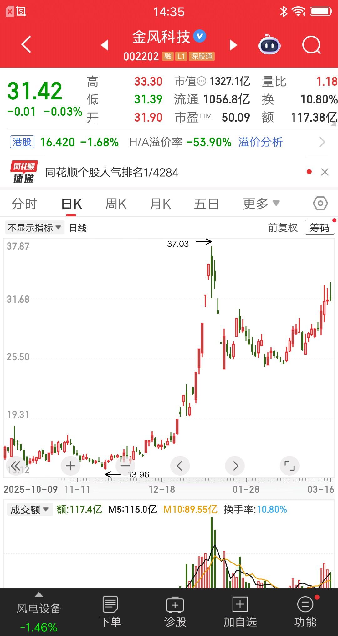 金风科技最高冲到5.66%的涨幅,就开始震荡回落,目前运行到零轴了。人气也升到了热股榜第一位,说明关注的人非常多。无非是两类人,一种是被套的,自然每天都会看一眼。一种是认为还能走二波的,想找机会参与。 我们看日线,出于谨慎态度,还是应该看做超跌反弹。就是对前期的踩踏式杀跌,进行技术性修复,目的是给散户解套。这也是主力呵护市场的体现,即赚了散户的钱,又能让散户继续玩下去,真高明! 提醒大家,别把反弹当反转,头脑一热进去了。解套的人,别觉得自己又行了,你只不过是碰到了有良心的主力。