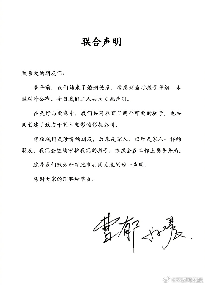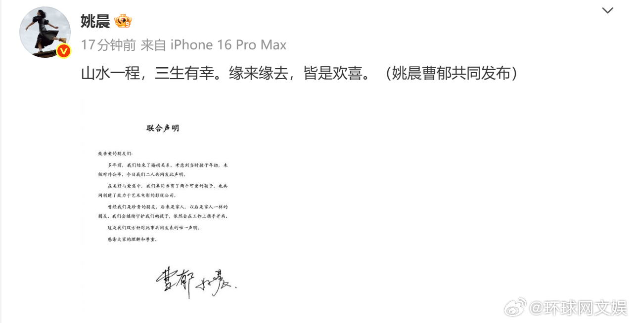 【#姚晨曹郁官宣离婚# 】刚刚,和曹郁发布联合声明宣布离婚:“山水一程,三生有幸。缘来缘去,皆是欢喜。”声明中称:“多年前,我们结束了婚姻关系,考虑到当时孩子年幼,未做对外公布”。据公开信息,姚晨与曹郁2012年举行婚礼,婚后育有一儿一女。 曹郁为中国内地摄影师,代表作包括《可可西里》《南京!南京!》《摆渡人》《妖猫传》《无问西东》《八佰》等。曾获得包括金鸡奖、华表奖、圣塞巴斯蒂安国际电影节最佳摄影奖。#姚晨曹郁离婚声明#