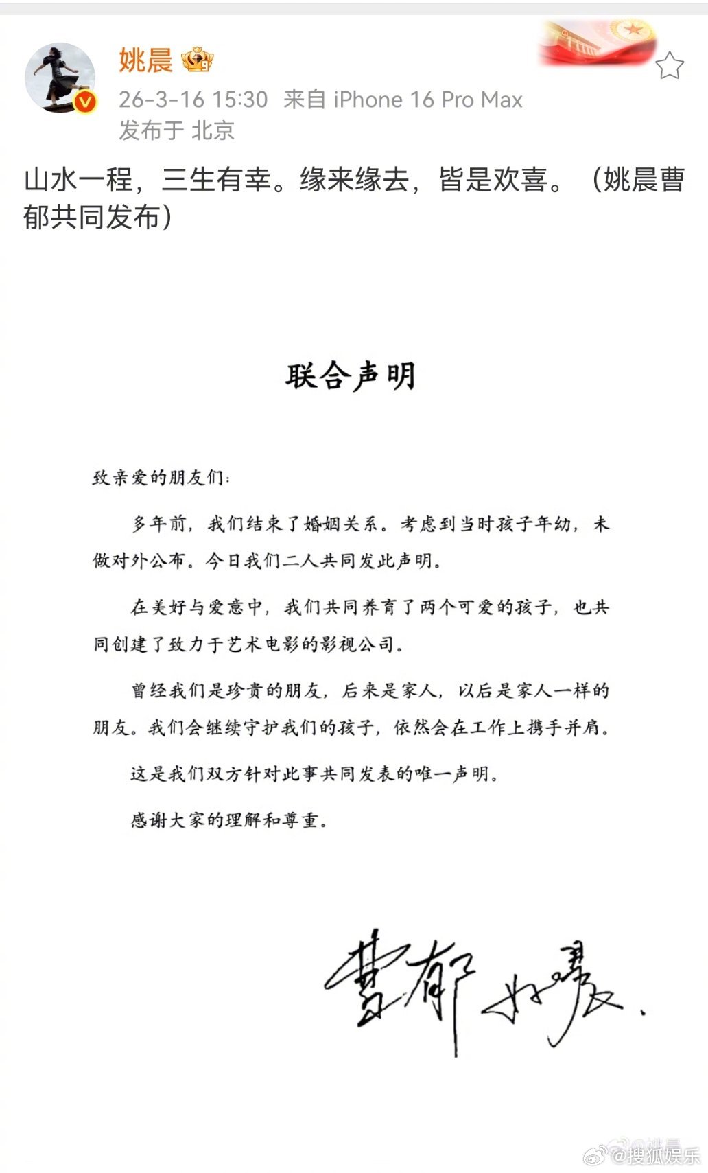 姚晨离婚 发布声明,宣布和曹郁已在多年前离婚,“多年前,我们结束了婚姻关系。考虑到当时孩子年幼,未做对外公布。今日我们二人共同发此声明。在美好与爱意中,我们共同养育了两个可爱的孩子,也共同创建了致力于艺术电影的影视公司。”姚晨曹郁官宣离婚