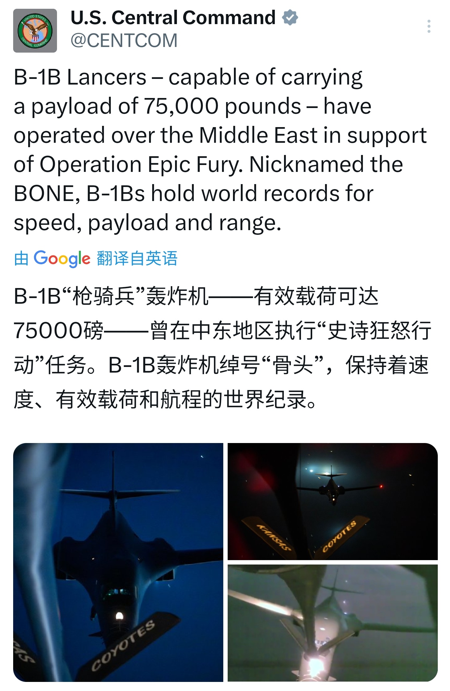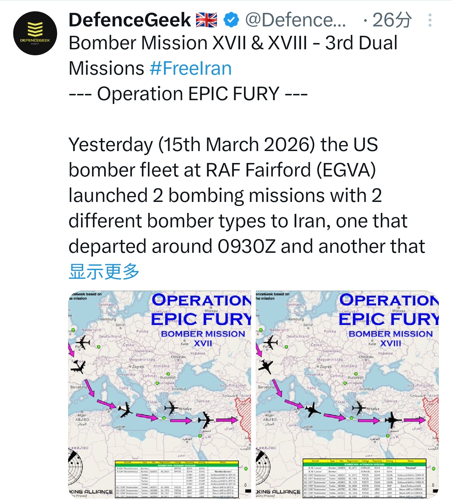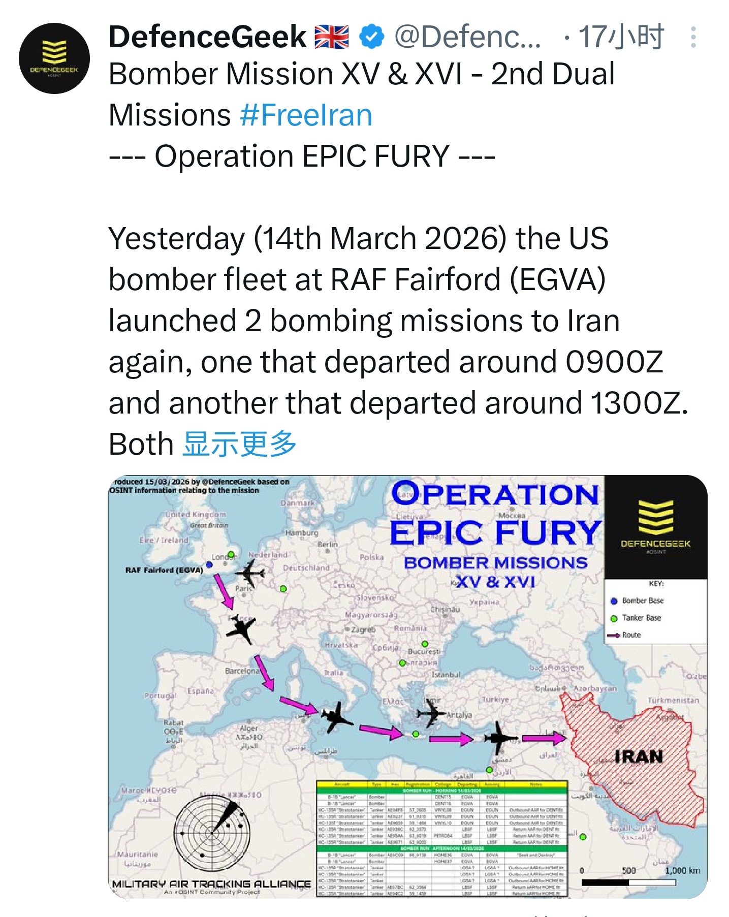 3月14日和15日,MD二等人的轰炸机继续从英国费尔福德皇家空军基地(EGVA)起飞前往伊朗执行轰炸任务:14日出动了两个波次各两架B-1B,15日出动了一个波次两架B-52H和一个波次两架B-1B,两架B-52H分别外挂了10和12枚的JASSM巡航导弹,B-1B则应该是使用内部弹舱挂载GBU-31(V)3钻地弹。美伊以冲突