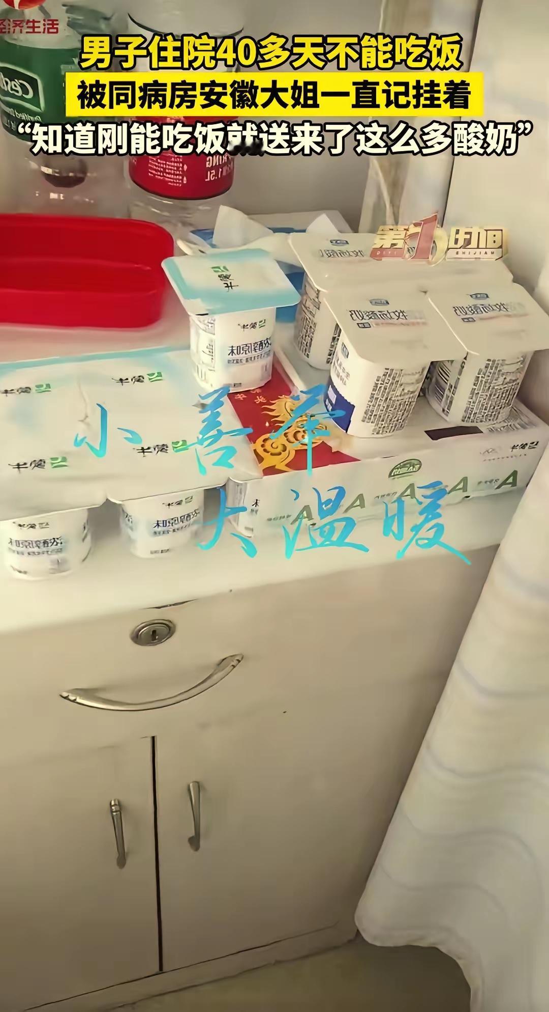 太暖心了!上海,一男子因病住院50天,其中40多天都无法吃饭,直到能吃饭那天,同病房大姐听说酸奶养胃,特意为他准备了好几种口味酸奶送过来,男子刚要推辞,大姐一句话让他差点破防了。 男子因甲状腺手术感染住院,前四十多天无法正常进食,全靠鼻饲维持身体,那种饥饿与无力,只有亲历者才能体会。 终于等到医生允许进食的那天,他刚松了口气,同病房的大姐就提着几盒不同口味的酸奶走了进来。 他连忙摆手推辞,觉得萍水相逢不该麻烦对方,可大姐按住酸奶,执意让他收下补身体。 甲状腺术后感染恢复阶段,饮食需从温和流食过渡,酸奶不仅易消化,还能补充营养,助力肠胃功能逐步恢复。 对于长期无法进食的患者来说,重新能自主进食的喜悦难以言喻,此时来自他人的关怀,更容易戳中内心最柔软的地方。 病房里的病友关系往往带着特殊的共情,大家同病相怜,很容易在细微处互相扶持,这份善意无关身份,只关乎本能的善良。 一杯酸奶看似普通,却承载着陌生人之间最朴素的共情,它不是贵重的礼物,却比任何东西都能温暖困境中的人。 在快节奏的现代社会,人们常常忙于自身事务,可在病痛面前,那份本能的善良会被重新唤醒,成为照亮困境的微光。 这件事之所以引发共鸣,正是因为它戳中了人们对善意的渴望,证明平凡生活里从不缺温暖,缺的只是传递温暖的行动。 有网友感慨“鼻饲四十天是谁顶得住啊,大姐救大命了吧”,在那样煎熬的日子里,这份善意确实像一剂强心针,让人瞬间破防。 男子四十多天的饥饿无助,大姐看似微小实则厚重的善意,共同描绘了一幅充满温度的日常画面,可我们在生活中,又是否愿意主动伸出手,给身边人一份这样的温暖? 在我看来,善意从来都不需要惊天动地,可能只是一句贴心的叮嘱,一份不起眼的小食物,就能在别人的困境里种下希望,我们每个人都可以成为传递温暖的人,哪怕力量微小,也能汇聚成光。 这事你怎么看?