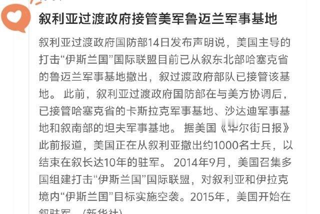 好消息!好消息!特大好消息!!!美国已经开始从叙利亚美军基地正式撤军了,叙利亚过渡政府军正式接管该基地。这应该是美国军队逐步离开中东的开始了。波斯人民太勇敢了,让美国人感到害怕了。美国完全撤离虽然还很远,但美国自己撤离,总比让美国无颜离去,死去好看一点。 最近叙利亚局势确实有了大变化,美国从几个关键基地撤军的事已经得到多家国际媒体确认。2026年2月,美国中央司令部宣布从al-Tanf、al-Shaddadi和Qasrak等基地撤出大部分部队,这些地方随后由叙利亚过渡政府控制的部队接管。al-Tanf是美军在叙利亚东南部靠近约旦和伊拉克边境的据点,主要用来监控伊朗方向的活动和打击ISIS残余势力。撤军后,叙利亚军队直接进驻,接管了那里的检查站和观察点。al-Shaddadi位于哈塞克省,是油田区附近的重要位置,美军撤离时带走了大部分装备,留下来的基础设施被过渡政府军接收。Qasrak基地规模更大,属于美军在叙东北部的主要后勤点,撤出后叙利亚国防部公开表示已完成接管工作。 这次撤军不是突然决定,而是从2025年底就开始酝酿的。美国国务院和国防部多次表态,说撤军是为了让叙利亚新当局自己承担起打击恐怖组织的责任,同时减少美军在当地的暴露风险。拜登政府后期和特朗普第二任期初期都把从中东“战略收缩”当成优先事项,伊拉克的美军人数也在同步减少,叙利亚自然成了下一个重点。过渡政府上台后,艾哈迈德·沙拉领导的团队跟美国谈过几轮,双方达成某种默契:美军有序离开,叙利亚方面承诺继续打击ISIS,不让极端势力死灰复燃。美国保留了在伊拉克北部的快速反应部队和空中支援能力,所以完全撤出中东还远,但地面常驻力量确实在大幅缩减。 沙拉这个人背景复杂,早年跟基地组织有直接联系,2003年后在伊拉克打过美军,2011年回叙利亚组建努斯拉阵线,后来改头换面成解放沙姆组织,控制伊德利卜多年。2024年底到2025年初,他的武装从北部一路南下,拿下大马士革,推翻了阿萨德政权。2025年1月底,他被各方武装推举为过渡总统,签了临时宪法,定下五年过渡期。现在他手里握着国防和内政大权,军队整合也在推进中,把各种派系的武装逐步编入正规序列。国际社会对他的态度两极分化:土耳其、卡塔尔和部分海湾国家愿意接触,俄罗斯和伊朗保持距离,美国则一边撤军一边继续观察,看他能不能兑现反恐承诺。 撤军这件事对中东格局影响不小。伊朗方向压力减轻,因为al-Tanf撤了以后,伊朗支持的民兵在叙东南部的活动空间变大。库尔德武装原本靠美军撑腰,现在不得不跟沙拉的政府谈整合,东北部几个省的行政控制权逐步移交。ISIS虽然被打得很惨,但零星袭击还在发生,过渡政府得自己扛起清剿任务。经济上,叙利亚拿到了一些阿拉伯国家的援助承诺,沙特和阿联酋表态愿意投资重建,制裁也在部分松动,但恢复正常还得几年时间。 说实话,美国这次撤得比较体面,比当年从阿富汗跑路强多了。自己主动走,总比被人赶着走要面子。波斯人(伊朗人)和他们的盟友这些年确实没少给美国添堵,从也门到伊拉克再到叙利亚,代理人战争打得美国头疼。特朗普上台后直接喊出“让盟友多出钱出力”,中东驻军成本高、收益低,国内支持度也不高,撤军符合当前美国战略调整的方向。当然,完全退出中东不可能,石油通道、反恐、以色列安全这些核心利益还在,顶多是从地面撤到海上和空中为主。 叙利亚老百姓苦了十几年,好不容易政权更迭,现在得看新政府能不能稳住局面,别再打来打去。沙拉团队现在最急的是重建经济、发工资、安置难民、平衡各派系,不然内部矛盾一爆发,又得重回老路。美国撤了,俄罗斯和土耳其的影响力反而可能上升,伊朗也会找机会填空。总之,这步棋走完,中东的棋盘又重新洗牌了,大家都得盯着看下一步怎么走。