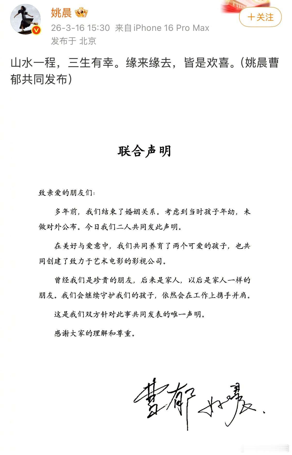 姚晨发声明,宣布她和摄影师曹郁已经离婚多年