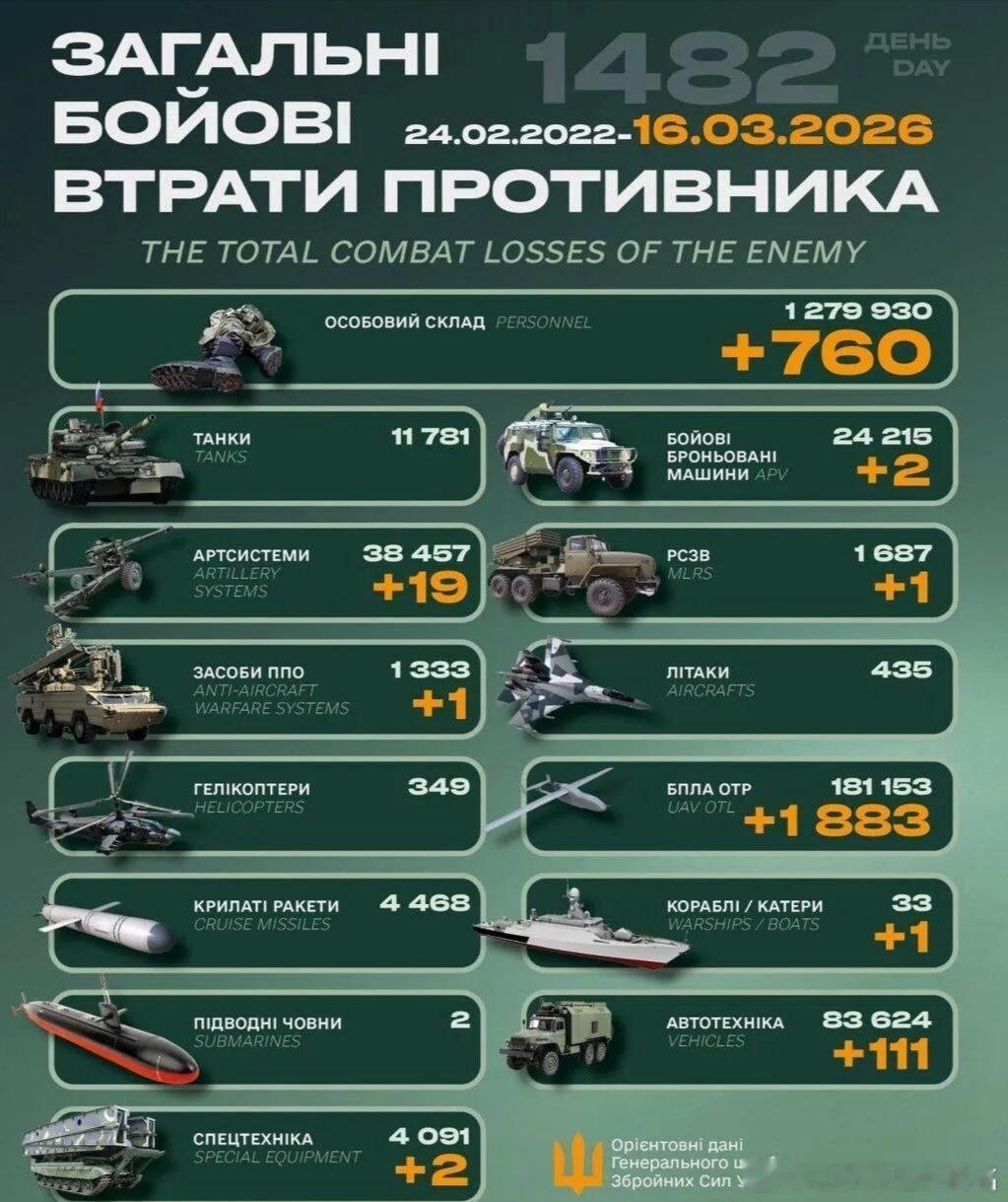 乌俄战争进入第1482天,乌克兰总参谋部发布战报:过去24小时乌俄双方交战91次,其中20次在胡利亚伊波列(3次在苏梅)、25次在康斯坦丁诺夫卡、7次在利曼、29次在波克罗夫斯克、7次在南顿涅茨克区域。毙伤俄760名。俄军累计损失1279930人。摧毁俄2辆装甲车、19门火炮、1个火箭发射装置、1套防空系统、1883架大型无人机、111辆军车、2件特种设备、1艘舰船。