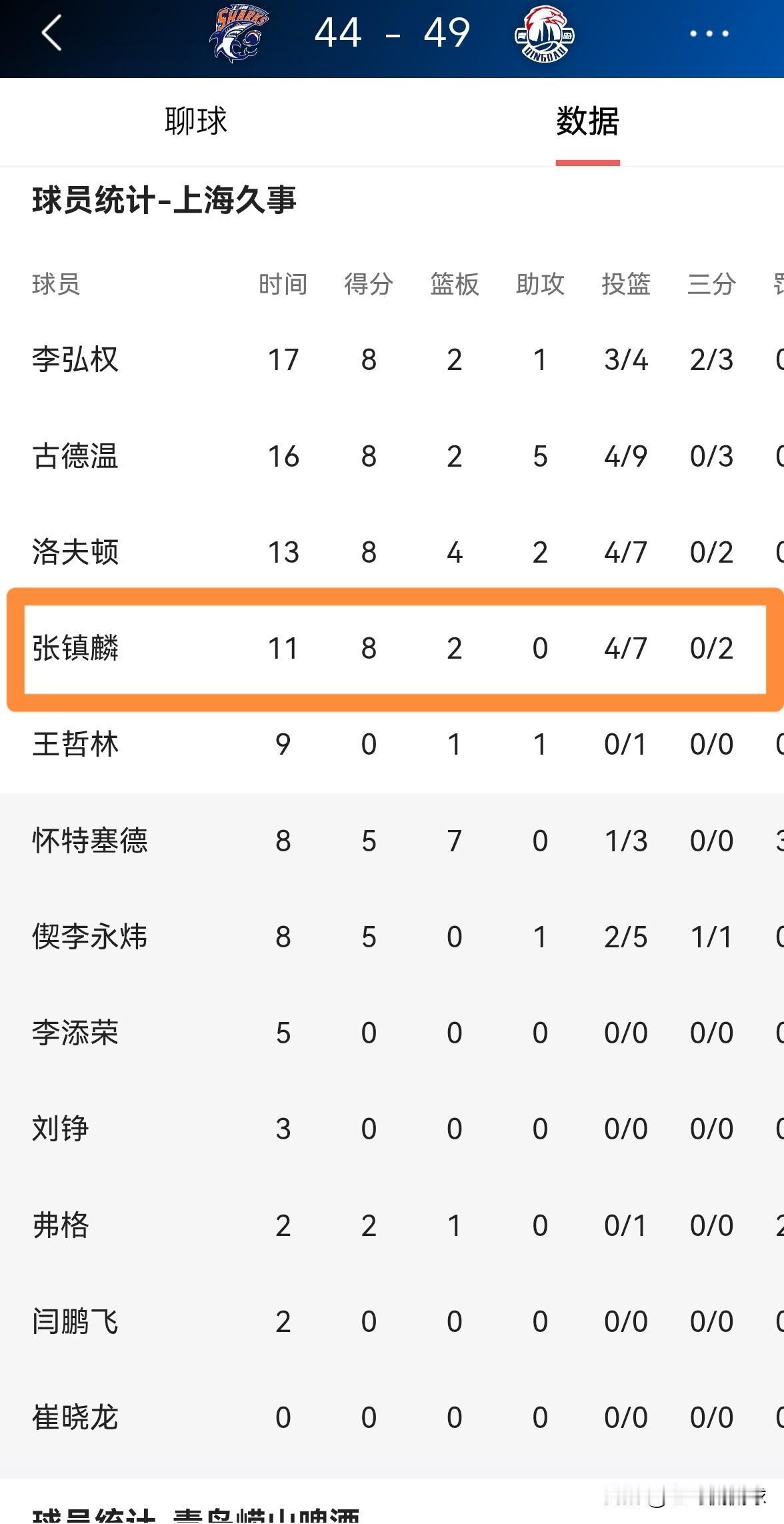 上海久事巨星张镇麟的三分球真是没救了!在今天上海久事主场迎战青岛崂山啤酒的比赛中,目前双方半场战罢,上海久事以44:49处于落后。在前两节比赛中,张镇麟再次在三分线外失准,他在首发出战的11分钟里,投篮7中4,其中三分球2中0得到8分2篮板1抢断,还有2次失误,他的场上正负值为-8。 作为上海久事的核心球员之一,本赛季开赛以来,张镇麟在三分线外的表现一直就非常的糟糕,真是无药可救了。