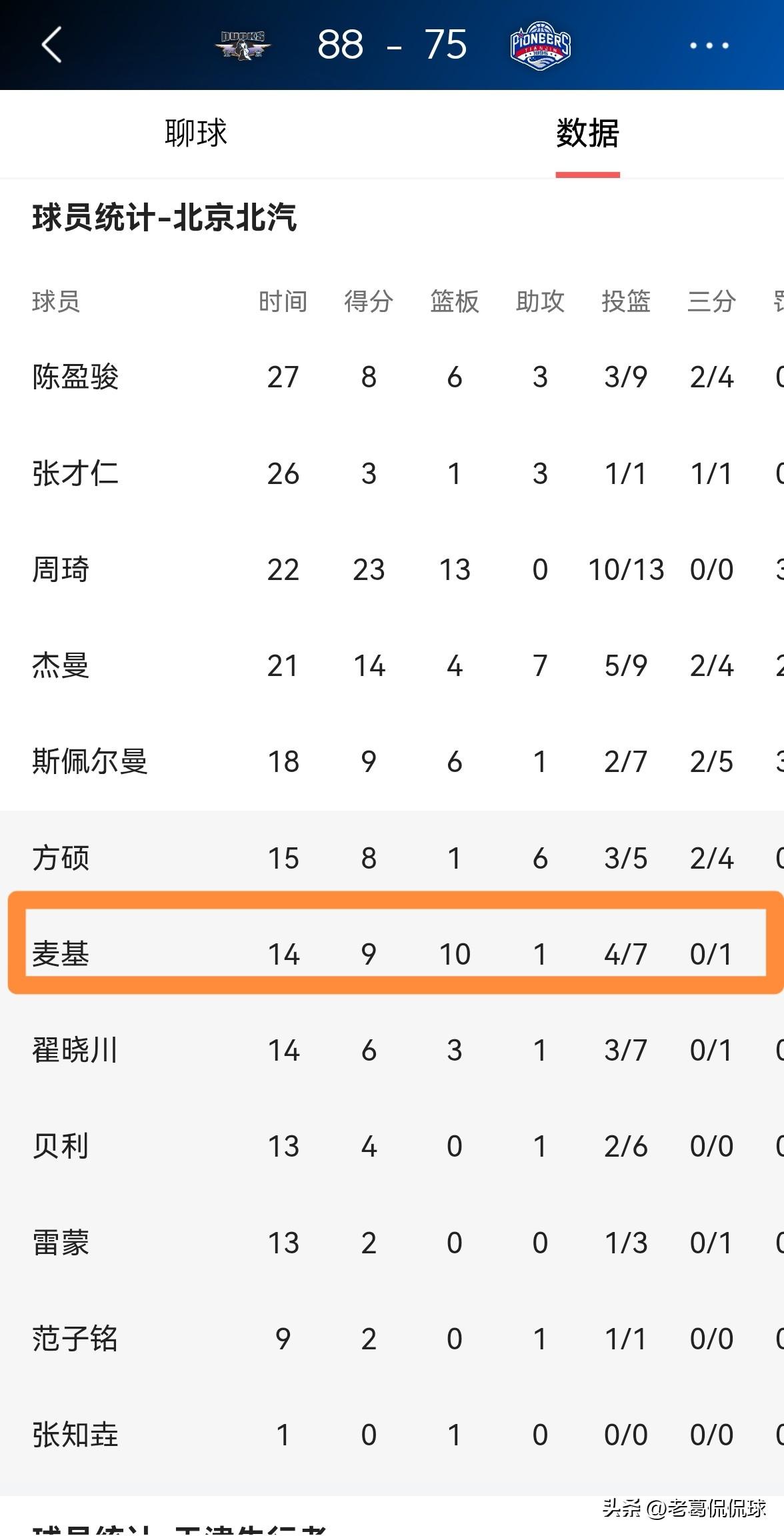 北京北汽外援麦基真是如鱼得水!在今天北京北汽主场以88:75击败天津先行者的比赛中,麦基在球队的体系中越发的如鱼得水,他在替补出战的14分钟里,投篮7中4,其中三分球1中0、罚球2中1轻松砍下9分10篮板1助攻1盖帽他的场上正负值为+11。 从麦基在北京北汽的表现来看,麦基真是太适合北京北汽了,尤其是麦基和周琦的搭配更是威力十足。
