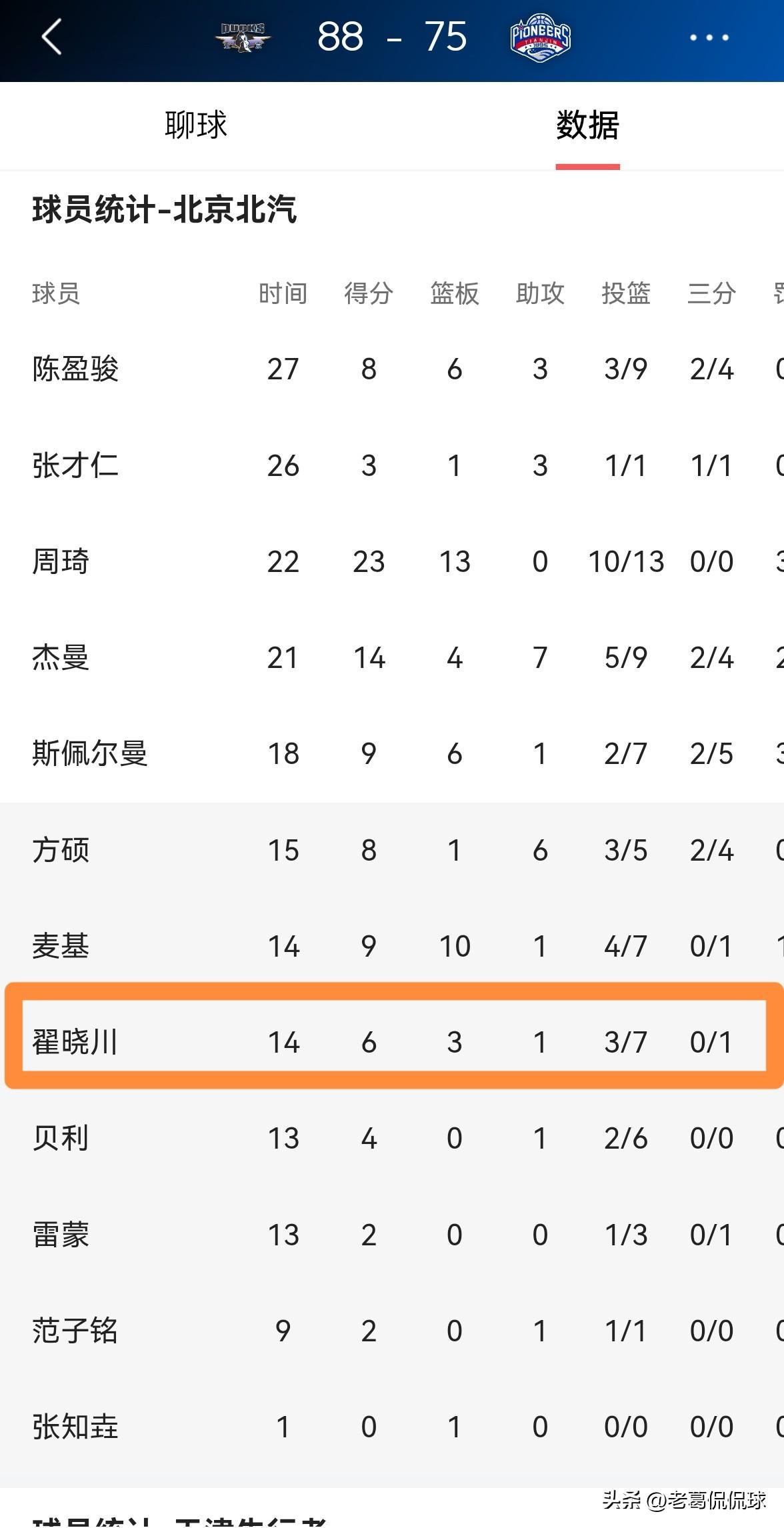 北京北汽老将翟晓川真是拼劲十足!在今天北京北汽主场以88:75力克天津先行者的比赛中,老将翟晓川在攻防两端都不遗余力,他在替补出战的14分钟里,投篮7中3,其中三分球1中0得到6分,还有3篮板1助攻,他的场上正负值为+7。 老实说,虽然翟晓川已经掉出了球队的核心阵容,但是只要翟晓川能够上场,他一定会在攻防两端都拼尽全力,这样的老将怎能不让人赞赏?