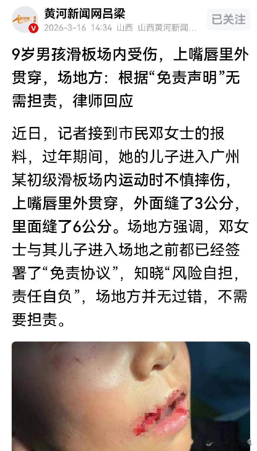 广东广州,9岁男孩在滑板场玩滑板时摔倒,上嘴唇被贯穿,外面缝了3公分,里面还得缝6公分,医生说是被尖锐的东西扎透了。可孩子受伤时,整个场地没有工作人员,监控刚好"正在测试"。家长找到场地方讨说法,对方拿出“免责声明”称,他们没有任何过错。家长:光收钱不担责,谁规定的? 大年初七,很多人还在过年,滑板场就是从那天开始正式收费营业的。 邓女士想着带孩子来活动,花了25块钱买的门票,也不算贵。 但却被要求,先签免责协议。 这事挺有意思,收钱的时候挺痛快,但进场前,得先把自己的身家性命都给交代了。 免责声明,要写清楚姓名、身份证号、电话。 门口还竖个大牌子上头写着:滑板是极限运动,初级区中级区都标好了,自己选适合自己的区域,出了事儿自己负责。 那牌子写得明明白白:后果及法律责任由本人完全承担。 但大多数家长压根没细想这里头的门道。 下午5点19分左右,邓女士的孩子,在滑过一个障碍物时突然摔了。 但具体怎么摔的,那个位置刚好是摄像头的盲区,监控拍不到。 更巧的是,本来应该有两个摄像头对拍,出事后,对方称:其中一个"正在测试"。 也就是说,关键时刻掉了链子。 孩子摔倒后,躺了足足一分多钟,才有人过来抱起孩子走出了场地。 他不是滑板场的工作人员,是旁边另一个小孩的教练。 也就是说,从孩子摔倒到被人抱起来,这段时间里,滑板场连个人都没有。 邓女士赶紧带孩子去了医院,光缝针就缝了两个多小时。 医生说,不太像是牙齿磕出来的,像是被什么尖锐的东西扎透的。 邓女士认为,如果是孩子自己摔倒了,牙齿磕到嘴唇,那可能确实是运动风险。 但如果是因为场地上有尖锐的东西没处理好,那就是另一回事了。 滑板场方说:免责声明写清楚了,场方一点责任没有。 还让邓女士自己花钱掏腰包去做伤口检测。 场方的意思是,孩子肯定是磕到了自己的滑板或者头盔。 可邓女士回去拍了滑板和头盔的照片,没有血迹,更别提什么磕碰的痕迹了。 场方说,当时肯定有工作人员在,只是那天刚好不是售票处那个班,所以具体情况不清楚。 邓女士不知道该怎么办就去咨询了律师。 律师说,免责声明合不合法还存疑。 但场方试图用一张免责声明,就把自己的责任全都撇干净,这事儿法律上站不住脚。 滑板场属于经营者,保障参与者人身安全是法定义务。 不是一张免责声明就能免除的。 更关键的是,滑板这种运动本身就危险,场地不仅设施要符合安全标准,还得有专业人员在现场监督、指导和及时救助。 孩子摔倒的时候,工作人员不在场,本身就属于管理上存在的重大缺失。 而且,孩子的伤口如果是尖锐物体造成的,直接证明了场地设施,存在安全隐患。 当然,家长一方也不是一点责任都没有。 滑板毕竟是极限运动,自家孩子能不能适应这种运动?家长心里都有数。 孩子玩的时候,家长在旁边也得尽到看护义务。 如果因为家长监护不力,导致或者加重了伤害,滑板场的责任,可以减轻。 说到底,这事儿的责任划分得综合判断。 但话说回来,一个9岁的孩子,在收费的专业运动场地里玩。 摔倒了连个工作人员都找不到,这事儿无论从哪个方面,滑板场都难辞其咎。 免责声明不是万能的护身符,该负的责任,一句"风险自担"是推不掉的。 从法律的角度分析,孩子在收费的滑板场受伤,家长也签了免责声明。 那么场地方真的不用担责了吗? 民法典第一千一百九十八条:宾馆等……公共场所的经营者、管理者或者群众活动的组织者,未尽到安全保障义务,造成他人损害的,应当承担侵权责任。 本案中,滑板场作为收费的经营场所,对进入场地的孩子负有安全保障义务。 可孩子受伤时,场地内没有工作人员,这属于管理上的缺失。 且孩子的伤口,疑似是由场地上的尖锐物体造成,说明场地设施可能存在安全隐患。 这些都表明,滑板场没有尽到安全保障义务。 因此,滑板场应当承担相应的侵权责任。 不能以家长签署了“免责声明”为由,来免除自己的责任。 你觉得,这起事故滑板场一方有没有责任呢? 关注@赵哥的法律观,欢迎评论区发表你的看法。