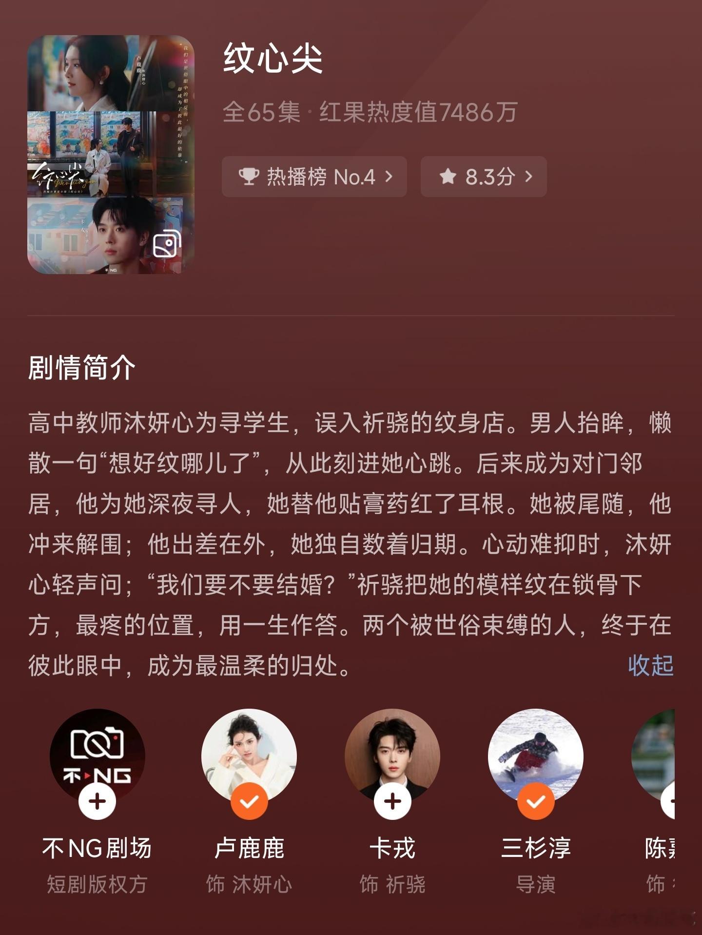 短国补完计划 NO.2《纹心尖》卢鹿鹿+卡戎,首日7486万热度,目前85万收藏。评分:7分,值得一看。细水长流风,在短国算很落地生活化的。2/3的暧昧期,1/3闪婚后。整体制作水平可以,拍摄风格和后期叙事基调有点氛围感,看了开头几集就确定是我偏好的风格,不过风格化程度不算突出。演员整体表现不错,暖味期女主嘴角难压的时候,我也跟着嘴角压不住了整体剧情很平淡,前期节奏有点问题,在十几集和二十几集的时候,我两次有点观看倦怠期。大概30集到40集的高度暧昧期是最好看的,one pick看电箱的第39集。闪婚后的剧情包含亲情线都中规中矩。第5集片源有点问题,有两次失声,片方居然还没更换。拍摄时的收音很多不够干净,而且有几处大失误,把不应该收进去的场外音给收进去了。