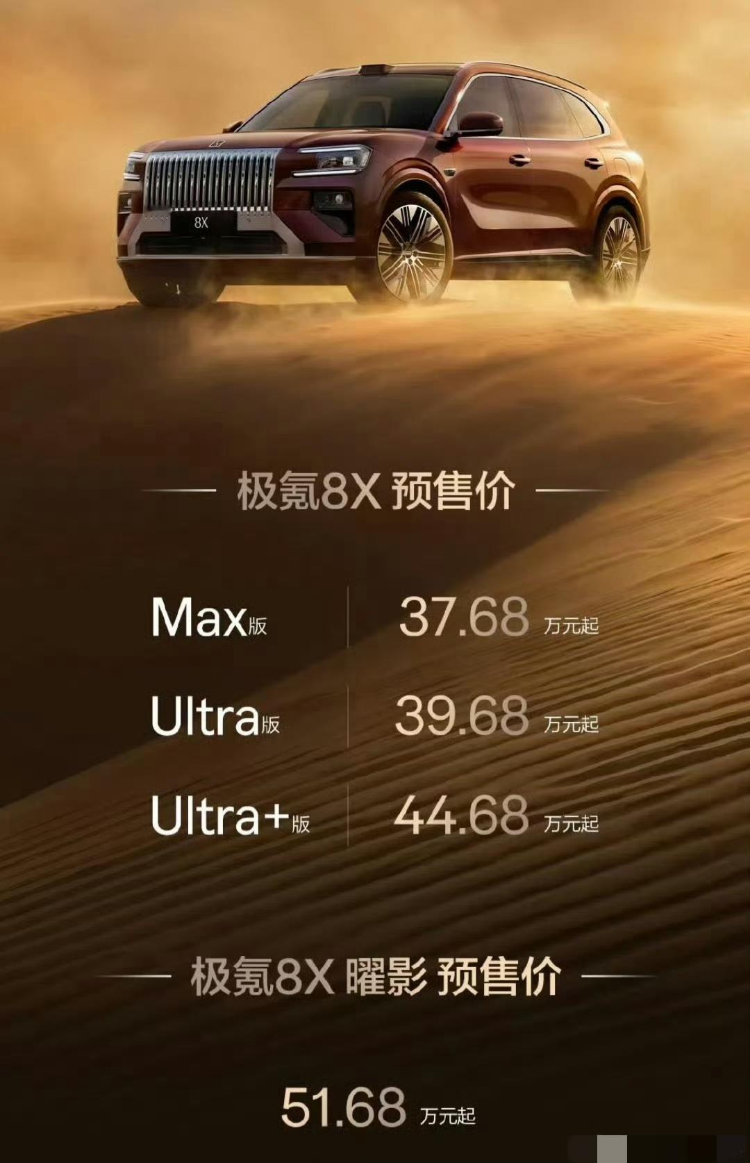 极氪8X终于要来了! 被誉为“新公路之王”“杭州湾卡宴”的极氪8X今日(3月16日)正式开启预售,起售价37.68万元,定位高性能旗舰SUV,主打运动豪华与极致驾控。 极氪8X普通款分Max、Ultra、Ultra+三个配置,共有5个车身颜色、4种内饰颜色、6款轮圈可选,预售价格分别为37.68万元、39.68万元、44.68万元;三电机的顶配性能版“曜影”提供专属的漆面和内饰,预售价51.68万元;普通版车型还可选六座附加包,在预售期间也有其他限时免费的选装赠送。 极氪8X全系标配2.0T插混专用发动机(205kW)及900V高压架构,支持12种动力模式智能切换;三电机版全球首进混动SUV 2秒加速俱乐部,馈电零百仅3.18秒,双电机版3.7秒;70度6C电池支持9分钟快充(20%-80%),CLTC综合续航最高1416公里。 加上行业首发4S级浩瀚AI数字底盘,集成闭式双腔空悬、主动稳定杆(0.2秒响应),麋鹿测试83.6km/h;一体式双门环车身+双2000MPa热成型钢,电池985防护标准,涉水深度达500mm。 由此,极氪完成了在SUV领域的拼图:极氪7X主攻家庭阵地,极氪8X主打高性能旗舰,极氪9X负责超豪华领域。 而极氪8X作为极氪高端SUV矩阵里的关键一环,预计将成为该品牌的又一核心车型。