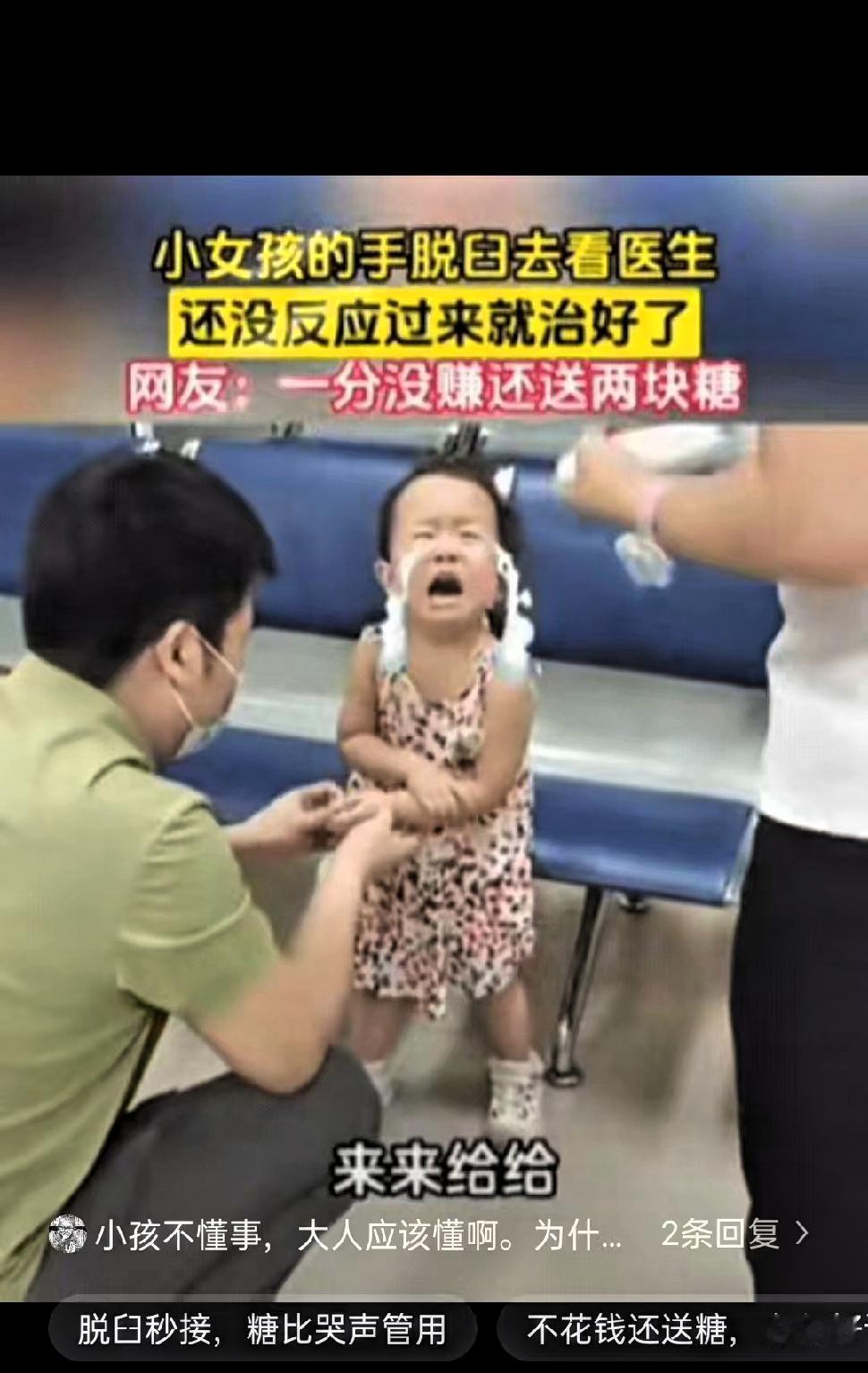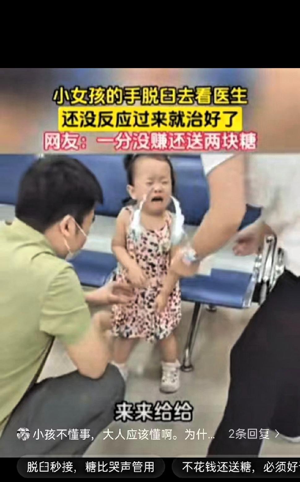 小女孩手脱臼,妈妈带她去看医生,结果,医生竟趁小女孩不备,直接把小女孩的手掰扯了一下,快速为孩子进行了关节复位,整个过程十分迅速。 因为瞬间的疼痛感,孩子哭得很厉害,一直说自己的手还没有好,情绪也比较激动。医生没有急于解释,而是拿出一颗糖,让孩子用刚刚复位的手来拿。孩子下意识地伸手接住糖果,之前不敢活动的手臂已经恢复正常,妈妈看到这一幕,也放心地笑了。 整个诊疗过程没有多余的检查,没有产生费用,医生依靠熟练的专业技能,快速解决了问题。从处理方式能看出,医生不仅技术扎实,也很了解儿童的心理特点,用温和的方式化解了孩子的紧张和抗拒,既验证了治疗效果,又安抚了孩子的情绪。 这样的场景在基层门诊并不少见,很多一线医生都有着丰富的处理经验,能用最简单、最直接的方式帮助患者减轻痛苦。对家长来说,遇到这样沉稳、专业又有耐心的医生,是一种实实在在的安心。 医者仁心往往体现在这些平凡小事里,不追求形式,不增加负担,以解决问题为核心,用专业和细心对待每一位患者。尤其是对待孩子,多一份耐心和巧思,就能让整个诊疗过程更温暖、更顺畅。 这件小事也让很多人明白,好医生不一定有多高调,而是技术靠谱、态度真诚,设身处地为患者着想。这种朴素又负责的行医态度,最值得大家尊重和认可。