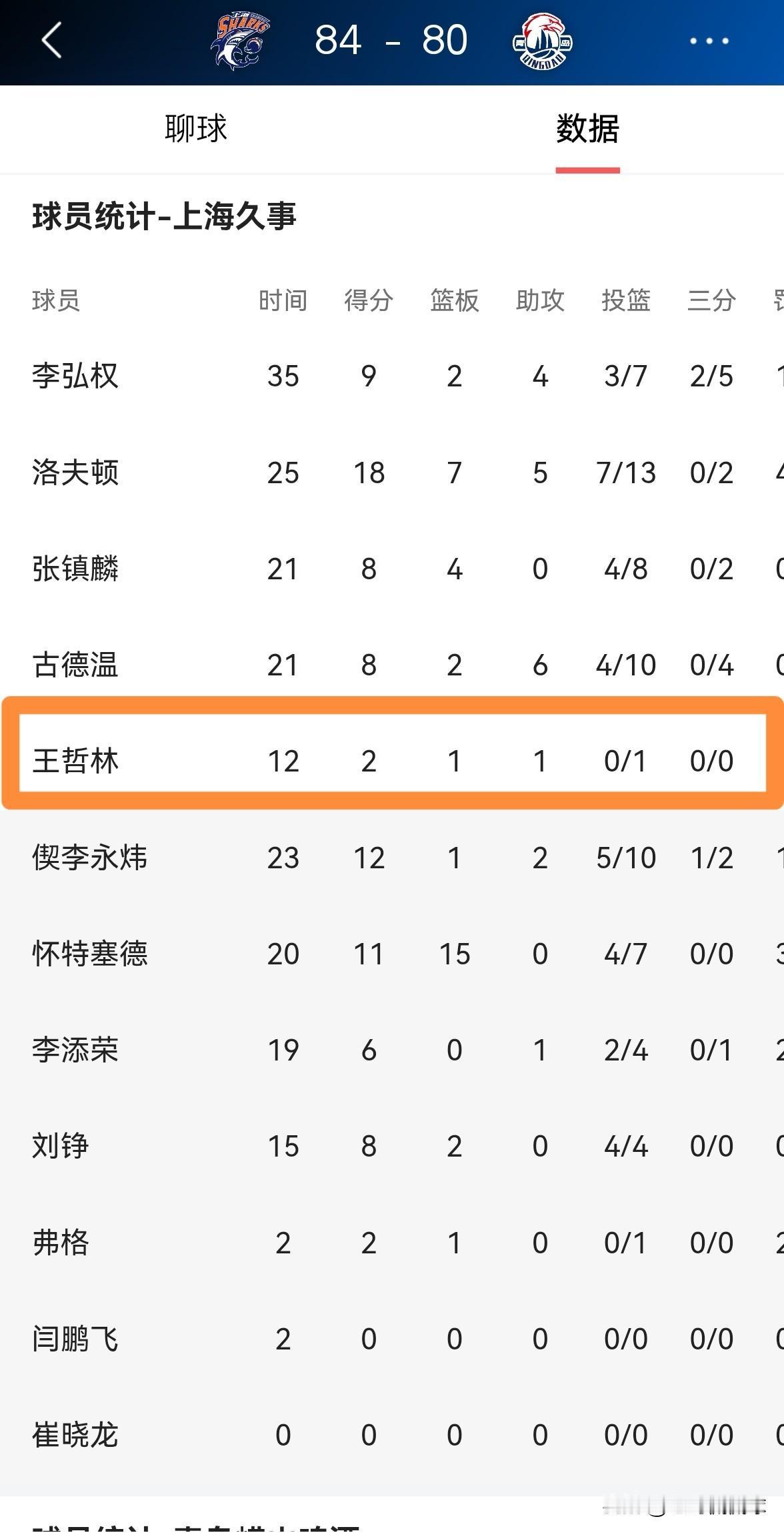 上海久事当家中锋王哲林真是毫无得分欲望!在今天上海久事主场以84:80战胜青岛崂山啤酒的比赛中,王哲林在12分钟的上场时间里仅仅出手了1次,他在进攻端毫无得分欲望。 整场比赛下来,王哲林首发出战12分钟,投篮1中0,仅仅依靠罚球得到2分,还有1篮板1助攻1盖帽,他的场上正负值为-1。