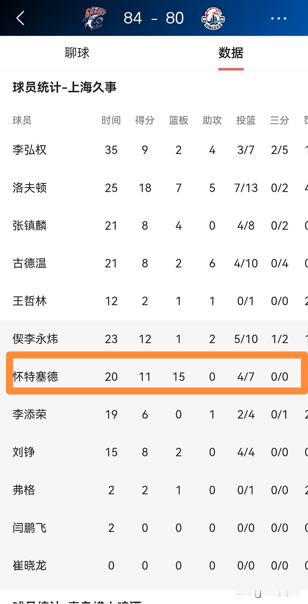 上海久事外援怀特塞德真是名副其实的两双机器!在今天上海久事主场以84:80力克青岛崂山啤酒的比赛中,怀特塞德再次砍下两双。 全场比赛下来,怀特塞德替补出战20分钟,投篮7中4,其中罚球4中3砍下11分15篮板,他的场上正负值为+7。 虽然怀特塞德已经36岁了,但是在CBA的赛场上,他依然是不折不扣的两双机器,两双对于怀特塞德而言如同家常便饭。