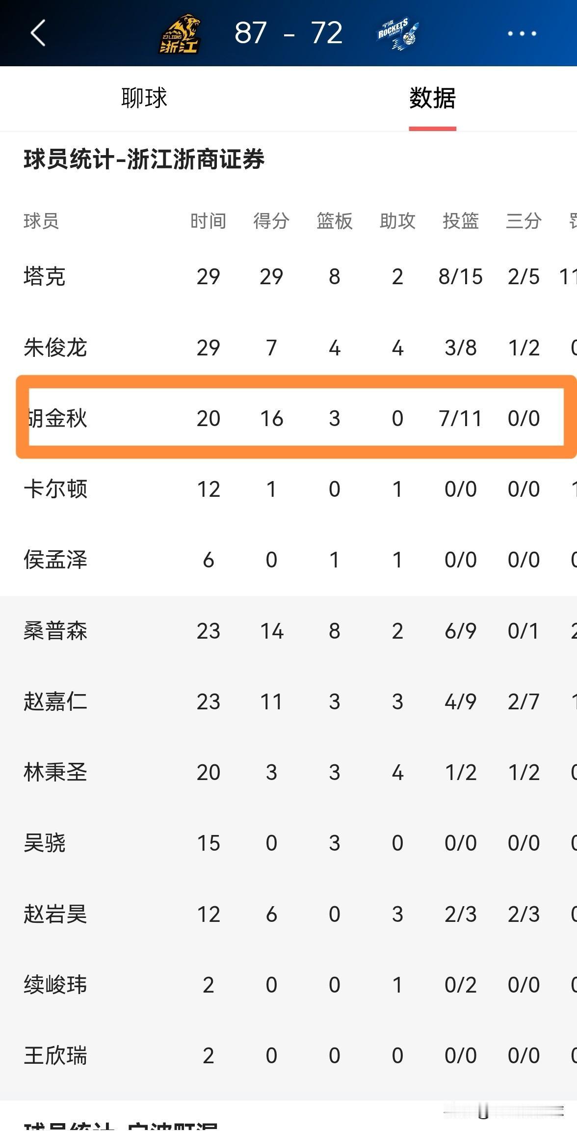 浙江浙商证券巨星胡金秋的篮板真是太少了!在今天浙江浙商证券主场以87:72击败宁波町渥的比赛中,胡金秋仅仅抢到3个篮板。。 整场比赛下来,胡金秋首发出战20分钟,投篮11中7,其中罚球2中2非常高效的砍下16分,不过仅有3个篮板,还有2次失误,他的场上正负值为+3。 实事求是的说,虽然本场比赛胡金秋的进攻效率一如既往的高效,但是他在篮板球保护方面确实比较差。