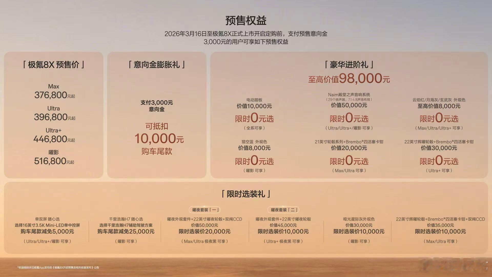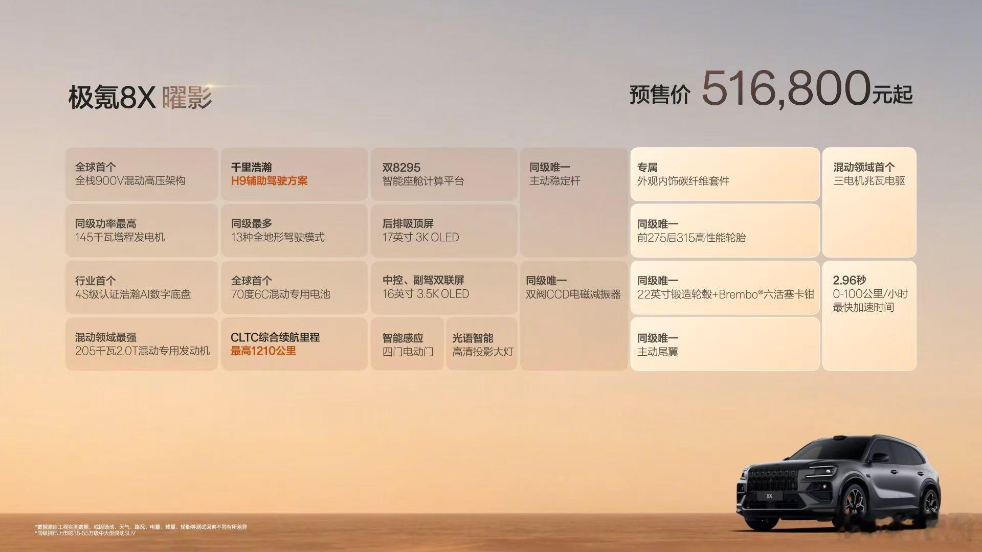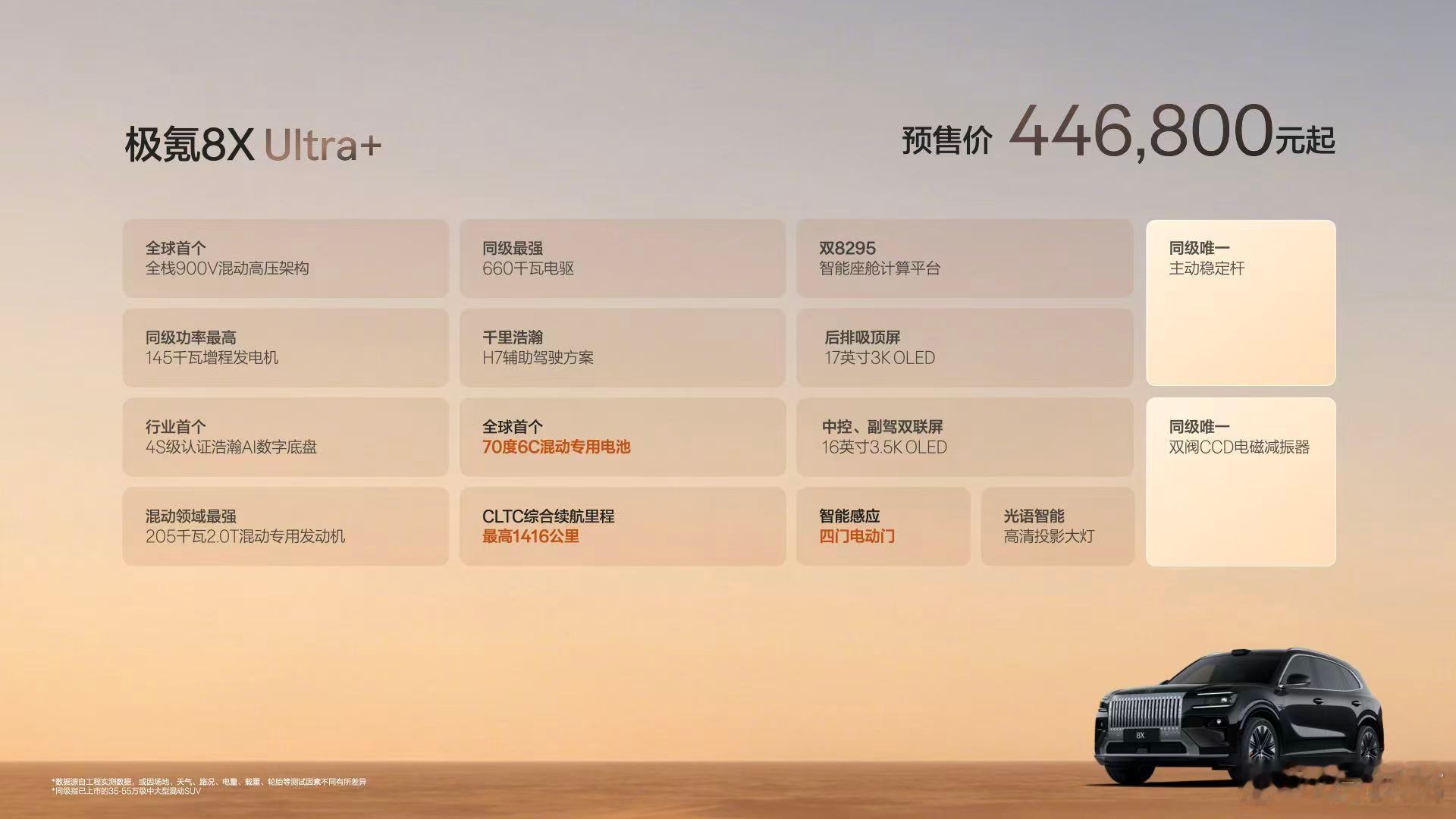 极氪8X预售37.68万起 极氪8X在大气外观和性能舒适上,更能满足家庭用户的情绪价值。这两台车,是最新的900V跟400V对比,是最高70度6C大电池跟53度4C电池对比,是地形能力更强的动力、底盘跟家用的对比。加上从9系起,极氪在情绪价值提供上开始爆发,持续推出更大气的原创设计,全球唯二的宾利同款音响和百万性能车底盘配备主稳杆,8X可能完全不像其它8系那样只能满足家庭用户了。极氪8X