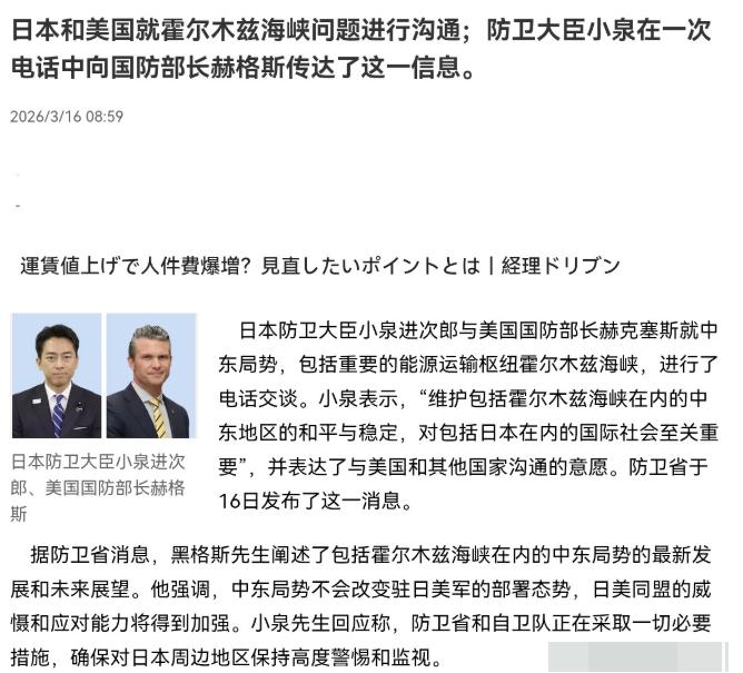 高市早苗难办了!日本不表态,美国国防部长赫格塞斯直接一通电话打到了日本,对日本施压! 3月16日,根据产经新闻报道,日媒称,日本和美国就霍尔木兹海峡问题进行沟通。赫格塞斯阐述了包括霍尔木兹海峡在内的中东局势的最新发展和未来展望。并称中东局势不会改变驻日美军的部署态势,日美同盟的威慑和应对能力将得到加强。 为什么高市早苗这么为难呢?这事儿得从几个方面说。首先,日本那和平宪法可不是摆设,白纸黑字写着不能随便介入他国战事。霍尔木兹海峡现在是什么地方?美伊正在打仗呢! 伊朗在那边又是布水雷又是发射导弹的,日本军舰要是开过去,那不就是直接参战了吗?这要是被伊朗当成靶子打,日本国内还不得炸锅? 日本95%以上的原油都得从中东进口,其中80%必须经过霍尔木兹海峡。这条最窄只有33公里的水道简直就是日本的能源生命线。现在可好,自从美以打击伊朗以来,霍尔木兹海峡的航运几乎瘫痪了。 数据显示,3月14号那天通过海峡的船只数量直接降到了零,而战前平均每天有77艘船通过。日本现在不得不释放创纪录的石油储备,相当于国内45天的用量。你说高市早苗敢得罪伊朗吗?要是把伊朗惹毛了,以后日本的油船还想不想过了? 还有,日本和伊朗历史上关系还不错,算是“传统友好国家”。2019年美国也提过类似要求,当时的安倍政府研究了半天,最后找了个折中方案:派军舰去附近海域收集情报,但就是不进霍尔木兹海峡。现在高市早苗要是答应美国,那就等于把伊朗当敌人看了,这外交关系还怎么处? 法律上也是个死结。日本政府能用的法律依据就那么几种:要么用安保相关法案,但那得先认定美军的行动符合国际法;要么用《自卫队法》的“海上警备行动”,可那只能保护日本自己的船;要么用《海盗应对法》,但伊朗军队又不是海盗。绕来绕去,哪个都不好使。 特朗普这招也挺损的,他专门挑在高市早苗3月19号访美之前发这个话,摆明了就是要当面逼宫。到时候两人一见面,特朗普要是直接问:“你们日本到底派不派军舰?”高市早苗该怎么回答?说派吧,国内法律过不去,伊朗那边也得罪不起;说不派吧,美国老大哥的面子往哪搁? 其实日本自卫队的扫雷能力在世界上都是一流的,真要派过去确实能帮上忙。但问题不在于能不能,而在于敢不敢。日本国内民意对派兵海外本来就敏感,再加上现在中东那地方炮火连天的,谁愿意把自己家的孩子送到那种地方去冒险? 所以高市早苗现在这个处境,真是前有狼后有虎。美国那边催得紧,国内法律卡得死,伊朗那边惹不起,老百姓那边也不好交代。她那个“正在考虑”的说法,其实就是想拖到访美结束,看看能不能蒙混过关。但特朗普是那么好糊弄的人吗?赫格塞斯那通电话已经说明了一切:美国等不及了。 说到底,日本在这个问题上根本没有选择的余地。答应美国,就是违宪+得罪伊朗+国内抗议;不答应美国,就是得罪最重要的盟友。高市早苗现在能做的,也就是在国会说几句漂亮话,然后祈祷特朗普别在见面的时候逼得太紧。不过按照特朗普那个脾气,这事儿恐怕没那么容易过关。