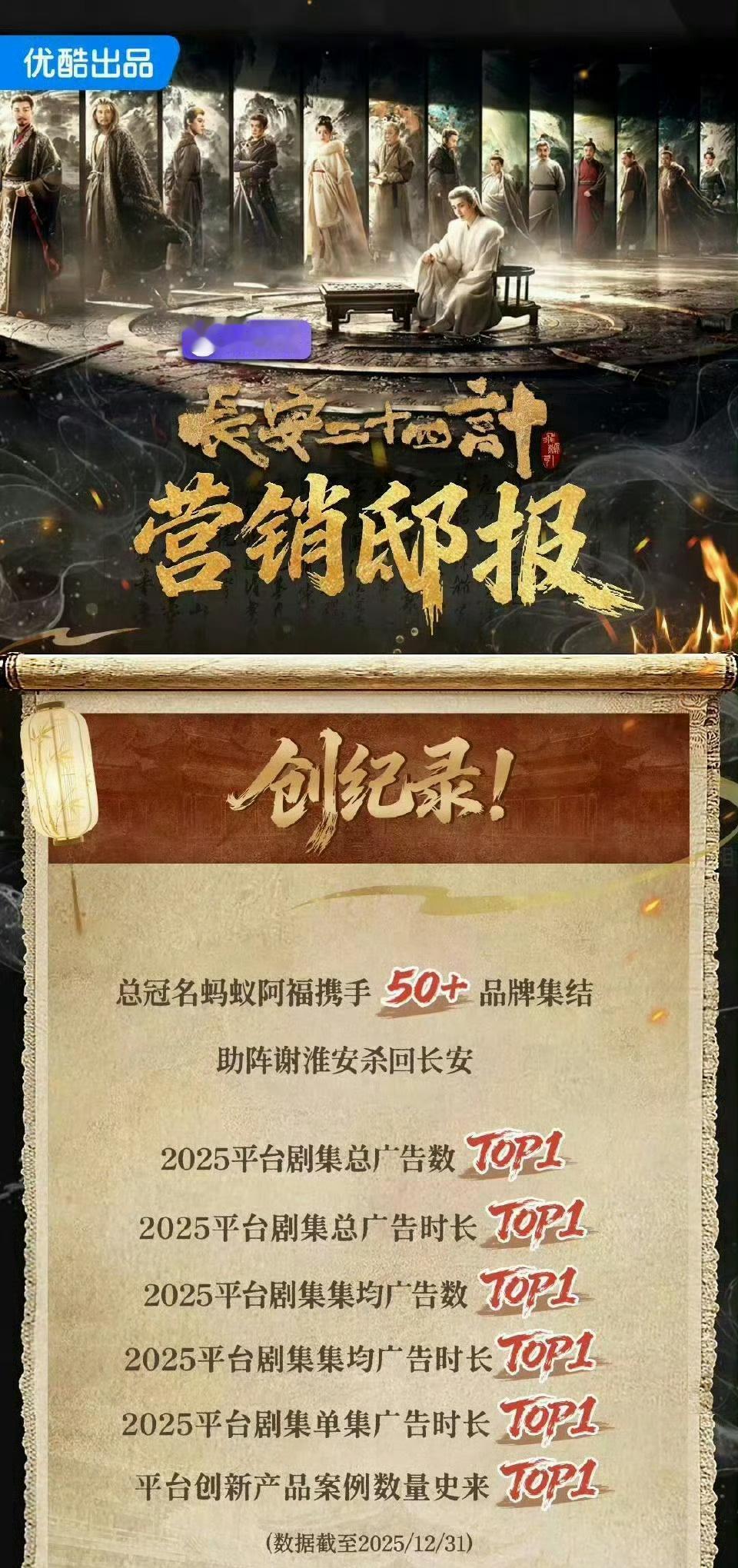 优酷2025年盈利了,其中12月剧集播放量全年最高, 已知12月优酷只播了长安二十四计一部大剧, 难怪当初高兴得又发营销邸报又发史冠战报: 成毅长安二十四计