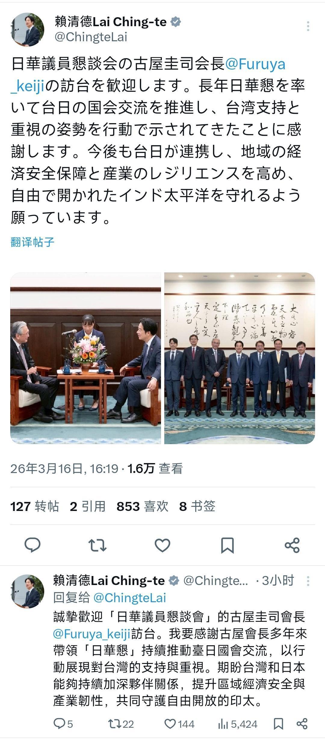 赖清德今天(3月16日)用中日文写道:“诚挚欢迎‘日华议员恳谈会’的古屋圭司会长访台。我要感谢古屋会长多年来带领‘日华恳’持续推动台日国会交流,以行动展现对台湾的支持与重视。期盼台湾和日本能够持续加深伙伴关系,提升区域经济安全与产业韧性,共同守护自由开放的印太。” [机智]评几句:赖清德发文欢迎古屋圭司窜台,尽显其“倚日谋独”的卑劣嘴脸与作死本性。古屋圭司是日本自民党资深右翼政客,现任“日华议员恳谈会”会长,曾多次参拜靖国神社,长期鼓吹“台湾有事就是日本有事”,否认慰安妇历史,反对村山谈话,频繁窜台勾连“台独”势力,是破坏中日关系和台海和平的顽固分子。赖清德与古屋圭司的勾连表演,不过是逆历史潮流的跳梁小丑行径,既动摇不了中国实现完全统一的坚定决心,也阻挡不了历史大势。