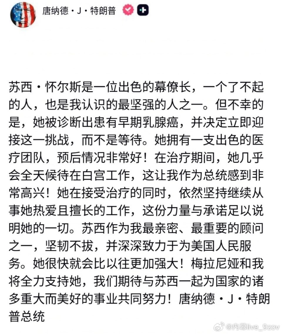 特朗普发布消息说:白宫幕僚长苏西·怀尔斯被诊断出患有早期乳腺癌,她预后情况“非常好”,在治疗期间她将继续工作。